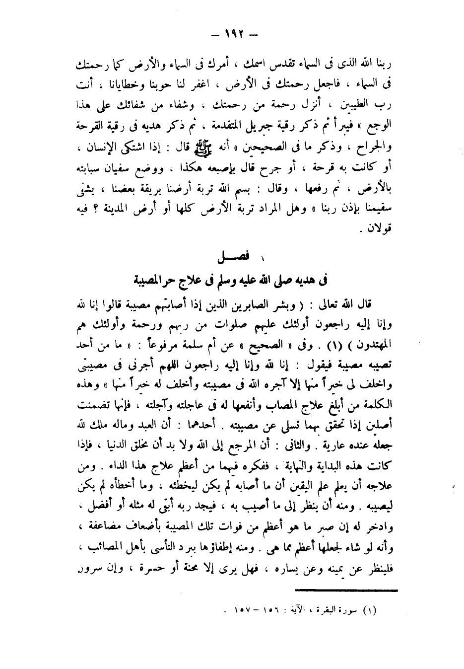 رَبَّنَا اللَّهَ الَّذِي فِي السَّمَاءِ تَقَدَّسَ اسْمُكَ، أَمْرُكَ فِي السَّمَاءِ وَالْأَرْضِ كَمَا رَحْمَتُكَ فِي السماء، فاجعل رحمتك في الأرض، اغفر لَنَا حُوبَنَا وَخَطَايَانَا، أَنْتَ رَبُّ الطَّيِّبِينَ، أَنْزِلْ رَحْمَةً مِنْ رَحْمَتِكَ، وَشِفَاءً مِنْ شِفَائِكَ عَلَى هذا الوجع فيبرأ» ، ثم ذكر رقية جبريل المتقدمة، ثم ذكر هديه في رقية القرحة والجراح، وذكر ما فِي الصَّحِيحَيْنِ، أَنَّهُ صَلَّى اللَّهُ عَلَيْهِ وَسَلَّمَ قَالَ: «إِذَا اشْتَكَى الْإِنْسَانُ، أَوْ كَانَتْ بِهِ قَرْحَةٌ، أَوْ جُرْحٌ قَالَ بِأُصْبُعِهِ هَكَذَا وَوَضَعَ سُفْيَانُ سَبَّابَتَهُ بِالْأَرْضِ، ثُمَّ رَفَعَهَا، وَقَالَ: بِسْمِ اللَّهِ تُرْبَةُ أَرْضِنَا بِرِيقَةِ بَعْضِنَا، يُشْفَى سَقِيمُنَا بِإِذْنِ ربنا» وهل المراد تربة الأرض كلها أو أرض المدينة؟ فيه قولان.