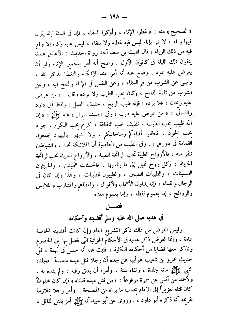 فِي هَدْيِهِ صَلَّى اللَّهُ عليه وسلم أقضيته وأحكامه وَلَيْسَ الْغَرَضُ مِنْ ذَلِكَ ذِكْرُ التَّشْرِيعِ الْعَامِّ وإن كانت أقضيته الخاصة عامة، وإنما الغرض ذكر هديه في الأحكام الجزئية التي فصل بها بين الخصوم، ونذكر معها قضايا من أحكامه الكلية، فثبت عنه أنه حبس في تهمة، ففي حَدِيثِ عَمْرِو بْنِ شُعَيْبٍ عَنْ أَبِيهِ عَنْ جَدِّهِ «أَنَّ رَجُلًا قَتَلَ عَبْدَهُ مُتَعَمِّدًا، فَجَلَدَهُ النَّبِيُّ صَلَّى اللَّهُ عَلَيْهِ وَسَلَّمَ مِائَةَ جَلْدَةٍ، وَنَفَاهُ سَنَةً، وَأَمَرَهُ أَنْ يَعْتِقَ رَقَبَةً، وَلَمْ يقده به» .