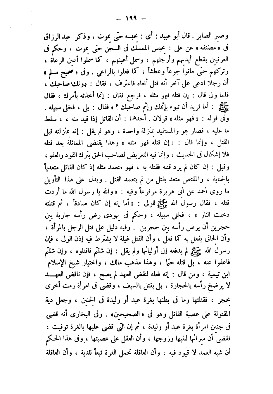 وصبر الصابر» قال أبو عبيد: أي: يحبسه حَتَّى يَمُوتَ، وَذَكَرَ عبد الرزاق فِي " مُصَنِّفِهِ " عَنْ علي: يُحْبَسُ الْمُمْسَكُ فِي السِّجْنِ حَتَّى يموت. وحكم في العرنيين بِقَطْعِ أَيْدِيهِمْ وَأَرْجُلِهِمْ، وَسَمْلِ أَعْيُنِهِمْ، كَمَا سَمَلُوا أعين الراعاة، وَتَرَكَهُمْ حَتَّى مَاتُوا جُوعًا وَعَطَشًا، كَمَا فَعَلُوا بالراعي.