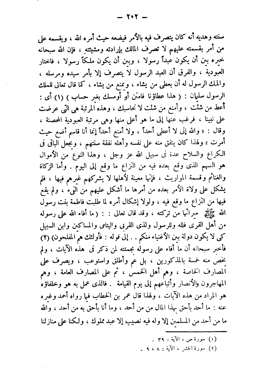فالذي عمل به هو وخلفاؤه هو المراد من الآيات، ولهذا قال عمر بن الخطاب فيما رواه أحمد وغيره عنه: «ما أحد بأحق بهذا المال من أحد، وما أنا بأحق به من أحد، والله ما من أحد من المسلمين إلا وله فيه نَصِيبٌ إِلَّا عَبْدٌ مَمْلُوكٌ، وَلَكِنَّا عَلَى مَنَازِلِنَا