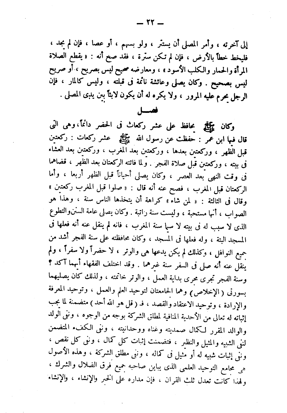 فصل وكان صَلَّى اللَّهُ عَلَيْهِ وَسَلَّمَ يُحَافِظُ عَلَى عَشْرِ رَكَعَاتٍ فِي الْحَضَرِ دَائِمًا، وَهِيَ الَّتِي قَالَ فيها ابن عمر: «حفظت عَنْ رَسُولِ اللَّهِ صَلَّى اللَّهُ عَلَيْهِ وَسَلَّمَ عَشْرَ رَكَعَاتٍ: رَكْعَتَيْنِ قَبْلَ الظُّهْرِ، وَرَكْعَتَيْنِ بَعْدَهَا، وركعتين بعد المغرب، وَرَكْعَتَيْنِ بَعْدَ الْعِشَاءِ فِي بَيْتِهِ، وَرَكْعَتَيْنِ قَبْلَ صلاة الفجر» «ولما فاتته الركعتان بعد الظهر، قضاهما في وقت النهي بعد العصر» ، «وكان يصلي أحيانا قبل الظهر أربعا» ، وأما الركعتان قبل المغرب، فصح عنه أنه قال: «صلوا قبل المغرب ركعتين وقال فِي الثَّالِثَةِ: لِمَنْ شَاءَ كَرَاهَةَ أَنْ يَتَّخِذَهَا الناس سنة» ، وهذا هو الصواب ; أنها مستحبة، وليست سنة راتبة. وَكَانَ يُصَلِّي عَامَّةَ السُّنَنِ وَالتَّطَوُّعَ الَّذِي لَا سَبَبَ لَهُ فِي بَيْتِهِ لَا سِيَّمَا سُنَّةُ الْمَغْرِبِ، فَإِنَّهُ لَمْ يُنْقَلْ عَنْهُ أَنَّهُ فَعَلَهَا في المسجد ألبتة، وله فعلها في المسجد، وكان محافظته عَلَى سُنَّةِ الْفَجْرِ أَشَدَّ مِنْ جَمِيعِ النَّوَافِلِ، وكذلك لم يكن يدعها هي والوتر، لا حضرا ولا سفرا، ولم ينقل عنه أنه صلى في السفر سنة راتبة غيرهما.