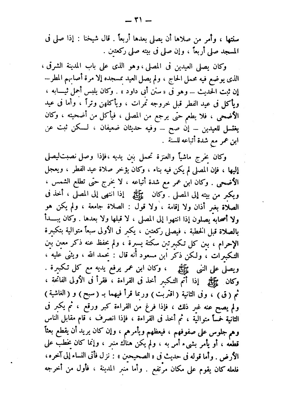 وكان يصلي العيدين في المصلى، وهو الذي على باب المدينة الشرقي، الَّذِي يُوضَعُ فِيهِ مَحْمِلُ الْحَاجِّ، وَلَمْ يُصَلِّ العيد بمسجده إلا مرة أصابهم مطر - إِنْ ثَبَتَ الْحَدِيثُ - وَهُوَ فِي "سُنَنِ أبي داود " وكان يلبس أجمل ثيابه، ويأكل في عيد الفطر قبل خروجه تمرات، ويأكلهن وترا، وأما في الْأَضْحَى فَكَانَ لَا يَطْعَمُ حَتَّى يَرْجِعَ مِنَ المصلى، فيأكل من أضحيته، وكان يغتسل للعيد - إن صح - وفيه حديثان ضعيفان، لكن ثَبَتَ عَنِ ابْنِ عُمَرَ مَعَ شِدَّةِ اتَّبَاعِهِ للسنة.
