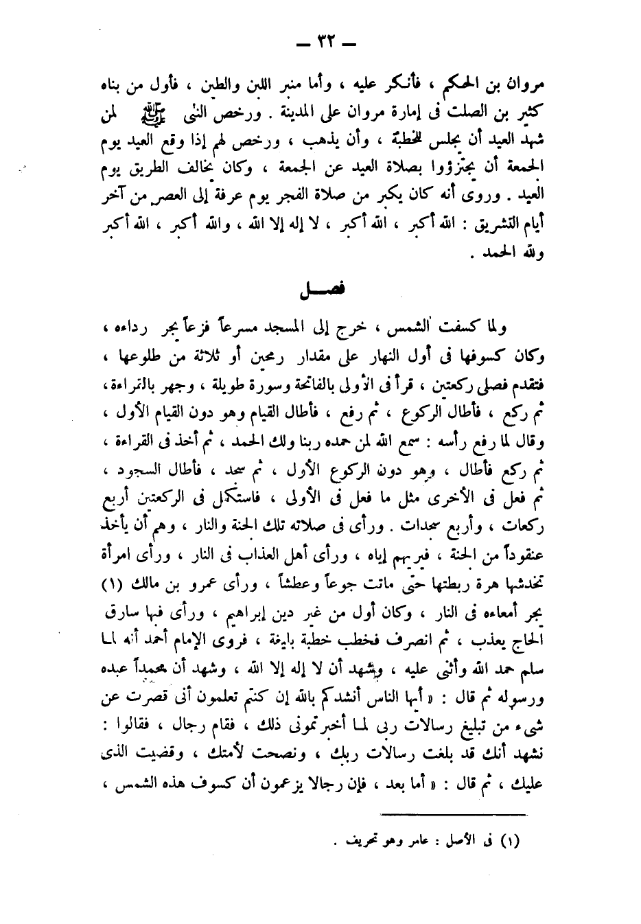 وَرَأَى فِي صَلَاتِهِ تِلْكَ الْجَنَّةَ وَالنَّارَ، وَهَمَّ أَنْ يَأْخُذَ عُنْقُودًا مِنَ الْجَنَّةِ، فَيُرِيَهُمْ إِيَّاهُ، وَرَأَى أَهْلَ الْعَذَابِ فِي النَّارِ، فَرَأَى امْرَأَةً تَخْدِشُهَا هِرَّةٌ رَبَطَتْهَا حَتَّى مَاتَتْ جُوعًا وَعَطَشًا، وَرَأَى عمرو بن مالك (¬1) يَجُرُّ أَمْعَاءَهُ فِي النَّارِ، وَكَانَ أَوَّلَ مَنْ غَيَّرَ دِينَ إِبْرَاهِيمَ، وَرَأَى فِيهَا سَارِقَ الْحَاجِّ يُعَذَّبُ، ثم انصرف فخطب خطبة بليغة، فروى الإمام أحمد أنه لَمَّا سَلَّمَ حَمِدَ اللَّهَ وَأَثْنَى عَلَيْهِ، وَشَهِدَ أن لا إله إلا الله، وشهد أنه عبده ورسوله ثم: «أيها الناس أنشدكم بالله إن كنتم تعلمون أني قصرت عن شَيْءٍ مِنْ تَبْلِيغِ رِسَالَاتِ رَبِّي لَمَّا أَخْبَرْتُمُونِي ذلك؟ فقام رجال، فقالوا: نَشْهَدُ أَنَّكَ قَدْ بَلَّغْتَ رِسَالَاتِ رَبِّكَ، وَنَصَحْتَ لِأُمَّتِكَ، وَقَضَيْتَ الَّذِي عَلَيْكَ ثُمَّ قَالَ: أَمَّا بَعْدُ، فَإِنَّ رِجَالًا يَزْعُمُونَ أَنَّ كُسُوفَ هَذِهِ الشمس،