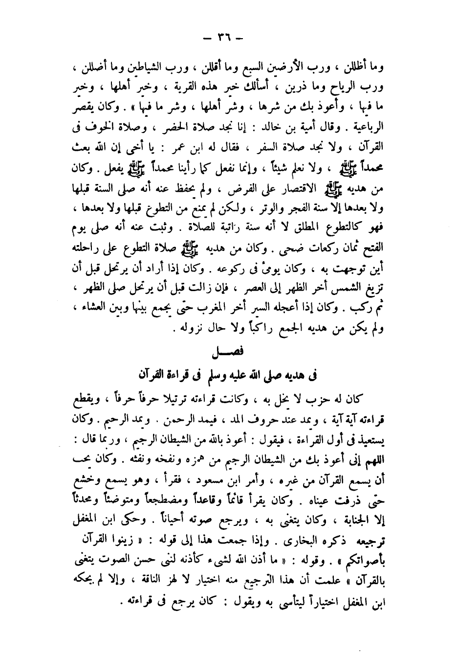 فِي هَدْيِهِ صَلَّى اللَّهُ عَلَيْهِ وَسَلَّمَ في قراءة القرآن كان له حزب لا يخل به، وكانت قراءته ترتيلا حرفا حرفا، ويقطع قراءته آية آية، ويمد عِنْدَ حُرُوفِ الْمَدِّ، فَيَمُدُّ الرَّحْمَنَ، وَيَمُدُّ الرَّحِيمَ. وكان يستعيذ في أول القراءة، فَيَقُولُ: «أَعُوذُ بِاللَّهِ مِنَ الشَّيْطَانِ الرَّجِيمِ» وَرُبَّمَا قال: «اللَّهُمَّ إِنِّي أَعُوذُ بِكَ مِنَ الشَّيْطَانِ الرَّجِيمِ من همزه ونفخه ونفثه» وَكَانَ يُحِبُّ أَنْ يَسْمَعَ الْقُرْآنَ مِنْ غَيْرِهِ، وأمر ابن مسعود، فقرأ وهو يسمع، وخشع حتى ذرفت عيناه. وكان يقرأ قائما وقاعدا ومضطجعا ومتوضئا ومحدثا إلا الجنابة، وكان يتغنى به، ويرجع صوته أحيانا. وحكى ابن المغفل ترجيعه، ذكره البخاري، وإذا جمعت هذا إلى قوله: «زينوا القرآن بأصواتكم» وَقَوْلِهِ: مَا أَذِنَ اللَّهُ لِشَيْءٍ كَإِذْنِهِ لِنَبِيٍّ حَسَنِ الصَّوْتِ يَتَغَنَّى بِالْقُرْآنِ عَلِمْتُ أَنَّ هَذَا الترجيع منه اختيار لا لهز الناقة، وإلا لم يحكه ابن المغفل اختيارا ليتأسى به ويقول: كان يرجع في قراءاته.