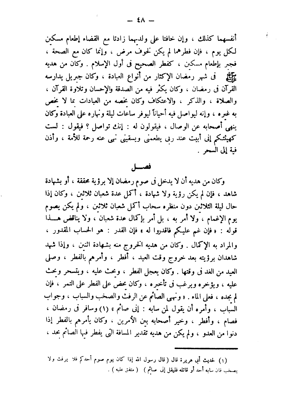 فصل وكان من هديه أَنْ لَا يَدْخُلَ فِي صَوْمِ رَمَضَانَ إِلَّا برؤية محققة، أو بشهادة شاهد، فإن لم يكن رُؤْيَةٌ وَلَا شَهَادَةٌ، أَكْمَلَ عِدَّةَ شَعْبَانَ ثَلَاثِينَ، وَكَانَ إِذَا حَالَ لَيْلَةَ الثَّلَاثِينَ دُونَ مَنْظَرِهِ سحاب أكمل شعبان ثلاثين، وَلَمْ يَكُنْ يَصُومُ يَوْمَ الْإِغْمَامِ، وَلَا أَمَرَ به، بل أمر بإكمال عدة شعبان وَلَا يُنَاقِضُ هَذَا قَوْلَهُ: «فَإِنْ غُمَّ عَلَيْكُمْ فاقدروا له» فإن القدر: هو الحساب المقدور، والمراد به الإكمال.