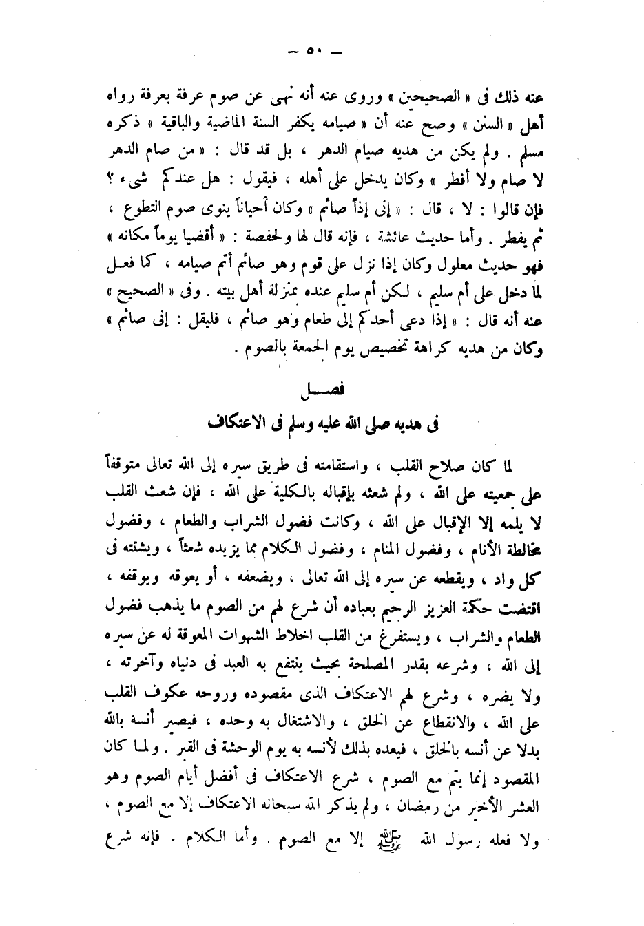 فِي هَدْيِهِ صَلَّى اللَّهُ عَلَيْهِ وَسَلَّمَ فِي الِاعْتِكَافِ لَمَّا كَانَ صَلَاحُ القلب، واستقامته في طريق ومسيره إِلَى اللَّهِ تَعَالَى مُتَوَقِّفًا عَلَى جَمْعِيِّتِهِ عَلَى اللَّهِ، وَلَمِّ شَعَثِهِ بِإِقْبَالِهِ بِالْكُلِّيَّةِ عَلَى اللَّهِ، فَإِنَّ شَعَثَ الْقَلْبِ لَا يَلُمُّهُ إِلَّا الْإِقْبَالُ على الله، وكانت فضول الشراب والطعام، وفضول مخالطة الأنام، وفضول المنام، وفضول الكلام مِمَّا يَزِيدُهُ شَعَثًا، وَيُشَتِّتُهُ فِي كُلِّ وَادٍ، ويقطعه عن سيره إلى الله تعالى، ويضعفه، أو يعوقه ويوقفه، اقتضت حكمة الْعَزِيزِ الرَّحِيمِ بِعِبَادِهِ أَنْ شَرَعَ لَهُمْ مِنَ الصَّوْمِ مَا يُذْهِبُ فُضُولَ الطَّعَامِ وَالشَّرَابِ، وَيَسْتَفْرِغُ مِنَ الْقَلْبِ أَخْلَاطَ الشَّهَوَاتِ الْمُعَوِّقَةِ لَهُ عَنْ سيره إلى الله، وَشَرْعِهِ بِقَدْرِ الْمَصْلَحَةِ بِحَيْثُ يَنْتَفِعُ بَهِ الْعَبْدُ في دنياه وأخراه، ولا يضره، وَشَرَعَ لَهُمُ الِاعْتِكَافَ الَّذِي مَقْصُودُهُ وَرُوحُهُ عُكُوفُ القلب على الله، والانقطاع عن الخلق، والاشتغال به وحده، فَيَصِيرُ أُنْسُهُ بِاللَّهِ بَدَلًا عَنْ أُنْسِهِ بِالْخَلْقِ، فَيَعُدُّهُ بِذَلِكَ لِأُنْسِهِ بِهِ يَوْمَ الْوَحْشَةِ فِي القبر.