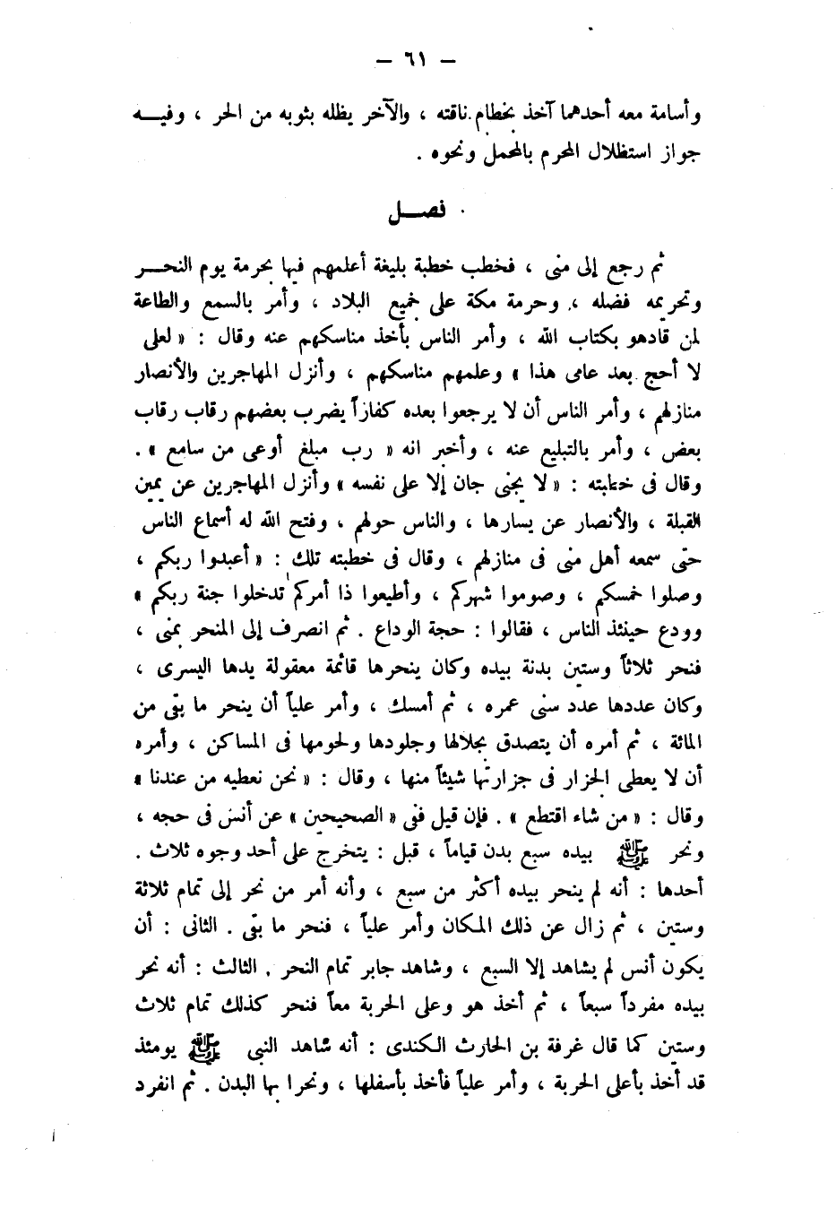 فصل ثم رجع إلى منى، فخطب خُطْبَةً بَلِيغَةً أَعْلَمَهُمْ فِيهَا بِحُرْمَةِ يَوْمِ النَّحْرِ وتحريمه وفضله، وحرمة مكة على جميع البلاد، وأمر بِالسَّمْعِ وَالطَّاعَةِ لِمَنْ قَادَهُمْ بِكِتَابِ اللَّهِ، وَأَمَرَ النَّاسَ بِأَخْذِ مَنَاسِكِهِمْ عَنْهُ، وَقَالَ: «لَعَلِّي لَا أَحُجُّ بَعْدَ عَامِي هَذَا» وَعَلَّمَهُمْ مَنَاسِكَهُمْ، وَأَنْزَلَ الْمُهَاجِرِينَ وَالْأَنْصَارَ مَنَازِلَهُمْ، وَأَمَرَ النَّاسَ أَنْ لَا يَرْجِعُوا بَعْدَهُ كُفَّارًا يَضْرِبُ بَعْضُهُمْ رِقَابَ بَعْضٍ، وَأَمَرَ بِالتَّبْلِيغِ عَنْهُ، وَأَخْبَرَ أَنَّهُ «رُبَّ مُبَلَّغٍ أَوْعَى مِنْ سَامِعٍ» وَقَالَ فِي خُطْبَتِهِ: «لَا يَجْنِي جَانٍ إِلَّا عَلَى نَفْسِهِ» وَأَنْزَلَ الْمُهَاجِرِينَ عَنْ يَمِينِ الْقِبْلَةِ، وَالْأَنْصَارَ عَنْ يَسَارِهَا، وَالنَّاسُ حَوْلَهُمْ، وَفَتَحَ اللَّهُ لَهُ أَسْمَاعَ النَّاسِ حَتَّى سمعه أَهْلُ مِنًى فِي مَنَازِلِهِمْ، وَقَالَ فِي خُطْبَتِهِ تِلْكَ: «اعْبُدُوا رَبَّكُمْ، وَصَلُّوا خَمْسَكُمْ، وَصُومُوا شَهْرَكُمْ، وَأَطِيعُوا ذَا أَمْرِكُمْ تَدْخُلُوا جَنَّةَ رَبِّكُمْ» وَوَدَّعَ حينئذ الناس، فقالوا: حجة الوداع.