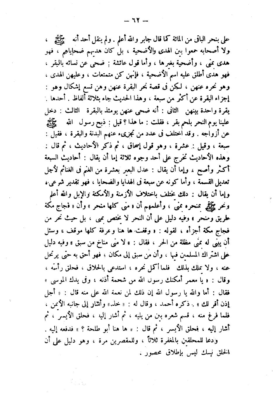 ونحر صَلَّى اللَّهُ عَلَيْهِ وَسَلَّمَ بِمَنْحَرِهِ بِمِنًى وَأَعْلَمَهُمْ أَنَّ «مِنًى كُلَّهَا مَنْحَرٌ» وَأَنَّ «فِجَاجَ مَكَّةَ طريق ومنحر» وفيه دَلِيلٌ عَلَى أَنَّ النَّحْرَ لَا يَخْتَصُّ بِمِنًى، بَلْ حَيْثُ نَحَرَ مِنْ فِجَاجِ مَكَّةَ أَجْزَأَهُ، لقوله: «وقفت ههنا وعرفة كلها موقف» وسئل أن يبنى له بمنى مظلة مِنَ الْحَرِّ، فَقَالَ: «لَا مِنًى مُنَاخُ مَنْ سبق» وفيه دَلِيلٌ عَلَى اشْتِرَاكِ الْمُسْلِمِينَ فِيهَا، وَأَنَّ مَنْ سبق إلى مكان، فَهُوَ أَحَقُّ بِهِ حَتَّى يَرْتَحِلَ عَنْهُ، وَلَا يملك بذلك.