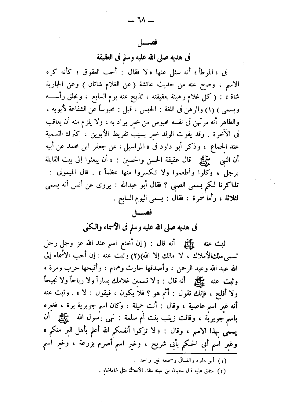 فِي هَدْيِهِ صَلَّى اللَّهُ عَلَيْهِ وَسَلَّمَ في العقيقة في " الموطأ " أنه سئل عنها، فَقَالَ: «لَا أُحِبُّ الْعُقُوقَ» ، كَأَنَّهُ كَرِهَ الِاسْمَ، وصح عنه من حديث عائشة: «عن الغلام شاتان، وعن الجارية شاة» ، «كُلُّ غُلَامٍ رَهِينَةٌ بِعَقِيقَتِهِ، تُذْبَحُ عَنْهُ يَوْمَ السابع، ويحلق رأسه ويسمى» (¬1) . والرهن في اللغة: الحبس، قيل: محبوسا عن الشفاعة لأبويه، والظاهر أنه مرتهن في نفسه محبوس من خير يراد به، ولا يلزم منه أن يعاقب في الآخرة. وَقَدْ يَفُوتُ الْوَلَدَ خَيْرٌ بِسَبَبِ تَفْرِيطِ الْأَبَوَيْنِ، كترك التسمية عند الجماع، وذكر أبو داود فِي " الْمَرَاسِيلِ " عَنْ جَعْفَرِ بْنِ مُحَمَّدٍ، عَنْ أَبِيهِ، أَنَّ النَّبِيَّ صَلَّى اللَّهُ عَلَيْهِ وَسَلَّمَ قَالَ في عقيقة الحسن والحسين «أن يبعثوا إِلَى بَيْتِ الْقَابِلَةِ بِرِجْلٍ، وَكُلُوا وَأَطْعِمُوا، وَلَا تكسروا منها عظما» . قال الميموني: تذاكرنا لكم يسمى الصبي؟ فقال أبو عبد الله: يُرْوَى عَنْ أنس أَنَّهُ يسمى لثلاثة، وأما سمرة فقال: يسمى اليوم السابع.