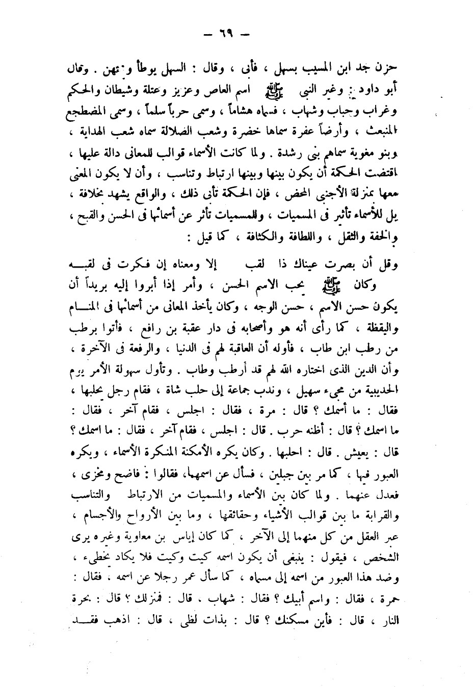 حزن جد ابن المسيب بسهل، فأبى، وقال: السهل يوطأ ويمتهن. وقال أبو داود: وَغَيَّرَ النَّبِيُّ صَلَّى اللَّهُ عَلَيْهِ وَسَلَّمَ اسْمَ الْعَاصِ، وَعَزِيزٍ، وَعَتَلَةَ، وَشَيْطَانٍ، وَالْحَكَمِ، وَغُرَابٍ، وَحُبَابٍ، وَشِهَابٍ، فَسَمَّاهُ هِشَامًا، وَسَمَّى حَرْبًا سلما، وسمى المضطجع المنبعث، وأرضا عَفْرَةً سَمَّاهَا خَضِرَةً، وَشَعْبَ الضَّلَالَةِ سَمَّاهُ شَعْبَ الهداية، وبنو مغوية سماهم بني رشدة. ولما كانت الأسماء قوالب للمعاني دالة عَلَيْهَا، اقْتَضَتِ الْحِكْمَةُ أَنْ يَكُونَ بَيْنَهَا وَبَيْنَهَا ارْتِبَاطٌ وَتَنَاسُبٌ، وَأَنْ لَا يَكُونَ الْمَعْنَى مَعَهَا بمنزلة الأجنبي المحض، فإن الحكمة تَأْبَى ذَلِكَ، وَالْوَاقِعُ يَشْهَدُ بِخِلَافِهِ، بَلْ لِلْأَسْمَاءِ تَأْثِيرٌ فِي الْمُسَمَّيَاتِ، وَلِلْمُسَمَّيَاتِ تَأَثُّرٌ عَنْ أَسْمَائِهَا فِي الْحُسْنِ وَالْقُبْحِ، وَالْخِفَّةِ وَالثِّقَلِ، وَاللَّطَافَةِ وَالْكَثَافَةِ، كما قيل: