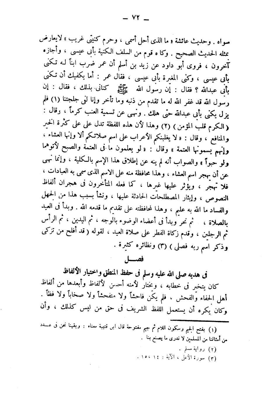 سواه. وحديث عائشة: «ما الذي أحل اسمي وحرم كنيتي» -غريب، لا يعارض بمثله الحديث الصحيح. وكره قوم من السلف الكنية بأبي عيسى، وأجازه آخَرُونَ، فَرَوَى أبو داود عَنْ زَيْدِ بْنِ أسلم أن عمر ضرب ابنا له تكنى بأبي عيسى، وكني المغيرة بأبي عيسى فقال عمر: أَمَا يَكْفِيكَ أَنْ تُكْنَى بأبي عبد الله؟ فَقَالَ: إِنَّ رَسُولَ اللَّهِ صَلَّى اللَّهُ عَلَيْهِ وسلم كناني بذلك، فَقَالَ: إِنَّ رَسُولَ اللَّهِ صَلَّى اللَّهُ عَلَيْهِ وسلم قد غَفَرَ اللَّهُ لَهُ مَا تَقَدَّمَ مِنْ ذَنْبِهِ وَمَا تَأَخَّرَ، وإنا لفي جلجلتنا (¬1) . فَلَمْ يَزَلْ يُكَنَّى بأبي عبد الله حَتَّى هلك. ونهى عَنْ تَسْمِيَةِ الْعِنَبِ كَرْمًا، وَقَالَ: «الْكَرْمُ قَلْبُ الْمُؤْمِنِ» (¬2) وَهَذَا لِأَنَّ هَذِهِ اللَّفْظَةَ تَدُلُّ عَلَى كثرة الخير والمنافع، وقال: «لا يغلبنكم الْأَعْرَابُ عَلَى اسْمِ صَلَاتِكُمْ، أَلَا وَإِنَّهَا الْعِشَاءُ، وإنهم يسمونها العتمة» . وقال: «لَوْ يَعْلَمُونَ مَا فِي الْعَتَمَةِ وَالصُّبْحِ لَأَتَوْهُمَا ولو حبوا» . والصواب أنه لم ينه عن إطلاق هذا الاسم بِالْكُلِّيَّةِ، وَإِنَّمَا نَهَى عَنْ أَنْ يُهْجَرَ اسْمُ العشاء، وهذا محافظة منه على الاسم الذي سمى به الْعِبَادَاتِ، فَلَا تُهْجَرُ وَيُؤَثِّرُ عَلَيْهَا غَيْرُهَا، كَمَا فَعَلَهُ الْمُتَأَخِّرُونَ فِي هِجْرَانِ أَلْفَاظِ النُّصُوصِ، وَإِيثَارِ الْمُصْطَلَحَاتِ الْحَادِثَةِ عَلَيْهَا، وَنَشَأَ بِسَبَبِ هَذَا مِنَ الْجَهْلِ وَالْفَسَادِ مَا اللَّهُ بِهِ عَلِيمٌ، وَهَذَا لمحافظته على تقديم ما قدمه الله. وبدأ في العيد بالصلاة ثم نحر، وَبَدَأَ فِي أَعْضَاءِ الْوُضُوءِ بِالْوَجْهِ، ثُمَّ الْيَدَيْنِ، ثم الرأس، ثم الرجلين، وقدم زكاة الفطر على صلاة العيد؛ لقوله: {قَدْ أَفْلَحَ مَنْ تَزَكَّى - وَذَكَرَ اسْمَ رَبِّهِ فَصَلَّى} [الْأَعْلَى: 14 - 15] (¬3) وَنَظَائِرُهُ كَثِيرَةٌ.