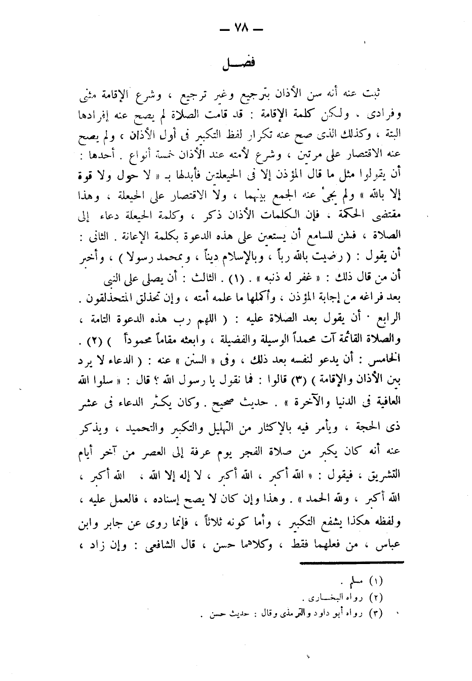 فصل ثبت عنه أنه سن الأذان بترجيع وغير ترجيع، وشرع الإقامة مثنى وفرادى، ولكن كلمة الإقامة: " قد قامت الصلاة " لم يصح عنه إفرادها لبتة، وكذلك الذي صَحَّ عَنْهُ تَكْرَارُ لَفْظِ التَّكْبِيرِ فِي أَوَّلِ الأذان، ولم يصح عنه الاقتصار على مرتين، وشرع لأمته عند الأذان خمسة أنواع، أحدها: أن يقولوا مثل ما قال المؤذن إلا في الحيعلتين، فأبدلها بِـ " لَا حَوْلَ وَلَا قُوَّةَ إِلَّا بِاللَّهِ "، ولم يجئ عنه الجمع بينهما، ولا الاقتصار على الحيعلة، وهذا مقتضى الحكمة، فإن كلمات الأذان ذكر، وكلمة الحيعلة دعاء إلى الصلاة، فَسُنَّ لِلسَّامِعِ أَنْ يَسْتَعِينَ عَلَى هَذِهِ الدَّعْوَةِ بكلمة الإعانة. الثاني: أن يقول: «رَضِيتُ بِاللَّهِ رَبًّا، وَبِالْإِسْلَامِ دِينًا، وَبِمُحَمَّدٍ رَسُولًا» ، وَأَخْبَرَ أَنَّ مَنْ قَالَ ذَلِكَ: «غُفِرَ لَهُ ذَنْبُهُ» (¬1) . الثَّالِثُ: أَنْ يُصَلِّيَ عَلَى النَّبِيِّ صَلَّى اللَّهُ عَلَيْهِ وَسَلَّمَ بَعْدَ فَرَاغِهِ مِنْ إِجَابَةِ المؤذن، وأكملها ما علمه أمته، وَإِنْ تَحَذْلَقَ الْمُتَحَذْلِقُونَ. الرَّابِعُ: أَنْ يَقُولَ بَعْدَ الصلاة عَلَيْهِ: «اللَّهُمَّ رَبَّ هَذِهِ الدَّعْوَةِ التَّامَّةِ، وَالصَّلَاةِ الْقَائِمَةِ، آتِ مُحَمَّدًا الْوَسِيلَةَ وَالْفَضِيلَةَ، وَابْعَثْهُ مَقَامًا محمودا» (¬2) . الخامس: أن يدعو لنفسه بعد ذلك، وفي " السنن " عنه: «الدُّعَاءُ لَا يُرَدُّ بَيْنَ الْأَذَانِ وَالْإِقَامَةِ (¬3) قَالُوا: فَمَا نَقُولُ يَا رَسُولَ اللَّهِ؟ قَالَ: سَلُوا اللَّهَ الْعَافِيَةَ فِي الدُّنْيَا وَالْآخِرَةِ» . حَدِيثٌ صَحِيحٌ. وكان يُكْثِرُ الدُّعَاءَ فِي عَشْرِ ذِي الْحِجَّةِ، وَيَأْمُرُ فِيهِ بِالْإِكْثَارِ مِنَ التَّهْلِيلِ وَالتَّكْبِيرِ وَالتَّحْمِيدِ، وَيُذْكَرُ عَنْهُ أَنَّهُ كَانَ يُكَبِّرُ مِنْ صَلَاةِ الْفَجْرِ يَوْمَ عَرَفَةَ إِلَى الْعَصْرِ مِنْ آخِرِ أَيَّامِ التَّشْرِيقِ، فَيَقُولُ: اللَّهُ أَكْبَرُ اللَّهُ أَكْبَرُ، لَا إلله الا الله، الله أكبر الله أَكْبَرُ، وَلِلَّهِ الْحَمْدُ. وَهَذَا وَإِنْ كَانَ لَا يَصِحُّ إِسْنَادُهُ، فَالْعَمَلُ عَلَيْهِ، وَلَفْظُهُ هَكَذَا، يَشْفَعُ التَّكْبِيرَ، وَأَمَّا كَوْنُهُ ثَلَاثًا، فَإِنَّمَا رُوِيَ عَنْ جابر وابن عباس من فعلهما فقط، وكلاهما حسن. قال الشافعي: وإن زاد