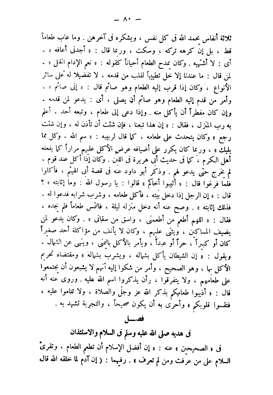 ثلاثة أنفاس يحمد اللَّهَ فِي كُلِّ نَفَسٍ، وَيَشْكُرُهُ فِي آخِرِهِنَّ. وما عاب طعاما قط، بل إن كَرِهَهُ تَرَكَهُ، وَسَكَتَ، وَرُبَّمَا قَالَ: أَجِدُنِي أَعَافُهُ، أي لَا أَشْتَهِيهِ. وَكَانَ يَمْدَحُ الطَّعَامَ أَحْيَانًا كَقَوْلِهِ: نعم الإدام الخل، لمن قال: ما عندنا إلا خل؛ تطييبا لِقَلْبِ مَنْ قَدَّمَهُ، لَا تَفْضِيلًا لَهُ عَلَى سائر الأنواع. وكان إذا قرب إليه الطعام وَهُوَ صَائِمٌ قَالَ: إِنِّي صَائِمٌ، وَأَمَرَ مَنْ قدم إِلَيْهِ الطَّعَامُ وَهُوَ صَائِمٌ أَنْ يُصَلِّيَ، أَيْ: يَدْعُو لِمَنْ قَدَّمَهُ، وَإِنْ كَانَ مُفْطِرًا أَنْ يأكل منه. وإذا دعي إلى طعام، وتبعه أحد، أعلم به رب المنزل، فقال: إِنَّ هَذَا تَبِعَنَا، فَإِنْ شِئْتَ أَنْ تَأْذَنَ لَهُ، وَإِنْ شِئْتَ رَجَعَ، وَكَانَ يَتَحَدَّثُ عَلَى طعامه، كما قال لربيبه: «سَمِّ اللَّهَ، وَكُلْ مِمَّا يَلِيكَ» ، وَرُبَّمَا كَانَ يُكَرِّرُ عَلَى أَضْيَافِهِ عَرْضَ الْأَكْلِ عَلَيْهِمْ مِرَارًا كَمَا يَفْعَلُهُ أَهْلُ الْكَرَمِ، كَمَا فِي حَدِيثِ أبي هريرة في اللبن. وَكَانَ إِذَا أَكَلَ عِنْدَ قَوْمٍ، لَمْ يَخْرُجْ حتى يدعو لهم. وذكر أبو داود عنه في قصة أبي الهيثم: فَأَكَلُوا فَلَمَّا فَرَغُوا. قَالَ: «أَثِيبُوا أَخَاكُمْ. قَالُوا: يَا رَسُولَ اللَّهِ، وَمَا إِثَابَتُهُ؟ قَالَ: إِنَّ الرَّجُلَ إِذَا دُخِلَ بَيْتُهُ، فَأُكِلَ طَعَامُهُ، وَشُرِبَ شَرَابُهُ، فَدَعَوْا لَهُ، فَذَلِكَ إِثَابَتُهُ» . وَصَحَّ عَنْهُ أَنَّهُ دَخَلَ مَنْزِلَهُ لَيْلَةً، فَالْتَمَسَ طَعَامًا، فَلَمْ يَجِدْهُ، فَقَالَ: «اللَّهُمَّ أَطْعِمْ مَنْ أَطْعَمَنِي، وَاسْقِ من سقاني» . وَكَانَ يَدْعُو لِمَنْ يُضِيفُ الْمَسَاكِينَ، وَيُثْنِي عَلَيْهِمْ، وَكَانَ لَا يَأْنَفُ مِنْ مُؤَاكَلَةِ أَحَدٍ صَغِيرًا كان أو كبيرا، حرا أو عبدا، ويأمر بالأكل باليمنى، وينهى عن الشمال، وَيَقُولُ: «إِنَّ الشَّيْطَانَ يَأْكُلُ بِشِمَالِهِ، وَيَشْرَبُ بِشِمَالِهِ» . ومقتضاه تحريم الأكل بها، وهو الصحيح، وَأَمَرَ مَنْ شَكَوْا إِلَيْهِ أَنَّهُمْ لَا يَشْبَعُونَ أَنْ يَجْتَمِعُوا عَلَى طَعَامِهِمْ وَلَا يَتَفَرَّقُوا، وَأَنْ يذكروا اسم الله عليه. وَرُوِيَ عَنْهُ أَنَّهُ قَالَ: «أَذِيبُوا طَعَامَكُمْ بِذِكْرِ اللَّهِ عَزَّ وَجَلَّ وَالصَّلَاةِ، وَلَا تَنَامُوا عَلَيْهِ فتقسوا قلوبكم» . وأحرى به أن يكون صحيحا، والتجربة تشهد بِهِ.