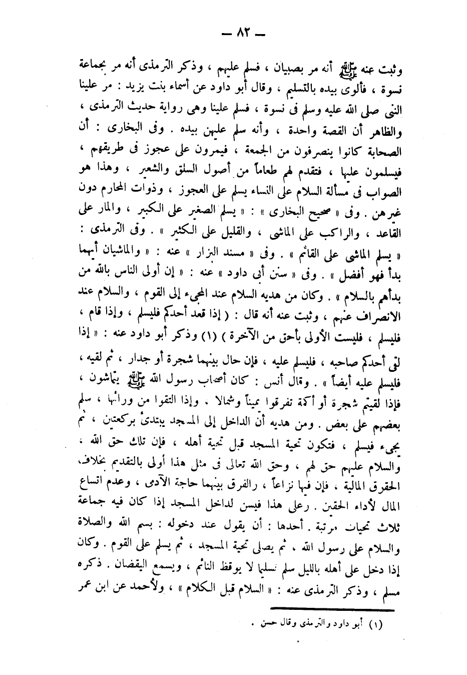 وَثَبَتَ عَنْهُ صَلَّى اللَّهُ عَلَيْهِ وَسَلَّمَ أَنَّهُ «مر بصبيان فسلم عليهم» . وذكر الترمذي «أنه مر بِجَمَاعَةِ نِسْوَةٍ، فَأَلْوَى بِيَدِهِ بِالتَّسْلِيمِ» . وَقَالَ أبو داود عَنْ أسماء بنت يزيد: «مَرَّ عَلَيْنَا النَّبِيُّ صَلَّى اللَّهُ عَلَيْهِ وَسَلَّمَ فِي نِسْوَةٍ، فَسَلَّمَ عَلَيْنَا» . وَهِيَ رِوَايَةُ حَدِيثِ الترمذي، وَالظَّاهِرُ أَنَّ الْقِصَّةَ وَاحِدَةٌ، وَأَنَّهُ سَلَّمَ عَلَيْهِنَّ بِيَدِهِ. وفي الْبُخَارِيِّ: أَنَّ الصَّحَابَةَ كَانُوا يَنْصَرِفُونَ مِنَ الْجُمُعَةِ، فَيَمُرُّونَ عَلَى عَجُوزٍ فِي طَرِيقِهِمْ، فَيُسَلِّمُونَ عَلَيْهَا، فَتُقَدِّمُ لَهُمْ طَعَامًا مِنْ أُصُولِ السَّلْقِ وَالشَّعِيرِ، وَهَذَا هُوَ الصَّوَابُ فِي مَسْأَلَةِ السَّلَامِ عَلَى النِّسَاءِ؛ يُسَلِّمُ عَلَى الْعَجُوزِ وَذَوَاتِ الْمَحَارِمِ دُونَ غيرهن. وفي " صحيح البخاري ": «يسلم الصَّغِيرِ عَلَى الْكَبِيرِ، وَالْمَارِّ عَلَى الْقَاعِدِ، وَالرَّاكِبِ على الماشي، والقليل على الكثير» . وفي الترمذي: «يُسَلِّمُ الْمَاشِي عَلَى الْقَائِمِ» . وَفِي " مُسْنَدِ البزار " عنه: «وَالْمَاشِيَانِ أَيُّهُمَا بَدَأَ فَهُوَ أَفْضَلُ» . وَفِي " سُنَنِ أبي داود " عَنْهُ: «إِنَّ أَوْلَى النَّاسِ بِاللَّهِ من بدأهم بالسلام» . وكان من هديه السَّلَامُ عِنْدَ الْمَجِيءِ إِلَى الْقَوْمِ، وَالسَّلَامُ عِنْدَ الِانْصِرَافِ عَنْهُمْ، وَثَبَتَ عَنْهُ أَنَّهُ قَالَ: «إِذَا قعد أحدكم فليسلم، وإذا قام، فليسلم، فليست الأولى بأحق مِنَ الْآخِرَةِ» (¬1) . وَذَكَرَ أبو داود عَنْهُ: «إِذَا لَقِيَ أَحَدُكُمْ صَاحِبَهُ، فَلْيُسَلِّمْ عَلَيْهِ، فَإِنْ حَالَ بَيْنَهُمَا شَجَرَةٌ أَوْ جِدَارٌ ثُمَّ لَقِيَهُ فَلْيُسَلِّمْ عَلَيْهِ أَيْضًا» . وَقَالَ أنس: كَانَ أَصْحَابُ رَسُولِ اللَّهِ صَلَّى اللَّهُ عَلَيْهِ وَسَلَّمَ يَتَمَاشَوْنَ، فَإِذَا لقيتهم شَجَرَةٌ أَوْ أَكَمَةٌ تَفَرَّقُوا يَمِينًا وَشِمَالًا، وَإِذَا الْتَقَوْا مِنْ وَرَائِهَا، سَلَّمَ بَعْضُهُمْ عَلَى بَعْضٍ. ومن هديه أن الداخل إلى المسجد يبتدئ بركعتين، ثم يجيء فيسلم، فَتَكُونُ تَحِيَّةُ الْمَسْجِدِ قَبْلَ تَحِيَّةِ أَهْلِهِ، فَإِنَّ تلك حق الله، والسلام عليهم حق لهم، وحق الله تعالى في مثل هذا أولى بِالتَّقْدِيمِ بِخِلَافِ الْحُقُوقِ الْمَالِيَّةِ، فَإِنَّ فِيهَا نِزَاعًا، والفرق بينهما حاجة الآدمي، وعدم اتساع المال لأداء الحقين. وَعَلَى هَذَا فَيُسَنُّ لِدَاخِلِ الْمَسْجِدِ إِذَا كَانَ فيه جماعة ثلاث تحيات مرتبة. أحدها: أَنْ يَقُولَ عِنْدَ دُخُولِهِ: بِسْمِ اللَّهِ وَالصَّلَاةُ والسلام على رسول الله، ثم يصلي تحية المسجد، ثم يسلم على القوم. وكان إذا دخل على أهله بالليل سلم تَسْلِيمًا لَا يُوقِظُ النَّائِمَ، وَيُسْمِعُ الْيَقْظَانَ. ذَكَرَهُ مسلم، وذكر الترمذي عنه: «السلام قبل الكلام» ، ولأحمد عن ابن عمر