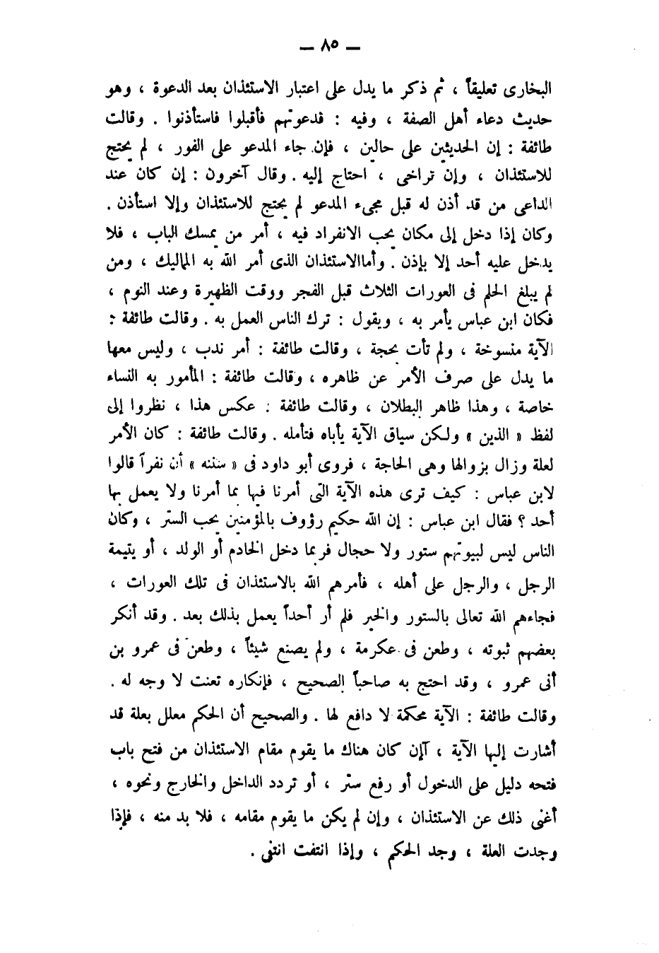 وكان إِذَا دَخَلَ إِلَى مَكَانٍ يُحِبُّ الِانْفِرَادَ فِيهِ، أمر من يمسك الباب، فلا يدخل عليه أحد إلا بإذن. وَأَمَّا الِاسْتِئْذَانُ الَّذِي أَمَرَ اللَّهُ بِهِ الْمَمَالِيكَ، وَمَنْ لَمْ يَبْلُغِ الْحُلُمَ فِي الْعَوْرَاتِ الثَّلَاثِ قَبْلَ الْفَجْرِ وَوَقْتَ الظَّهِيرَةِ وَعِنْدَ النَّوْمِ، فَكَانَ ابْنُ عَبَّاسٍ يَأْمُرُ بِهِ، وَيَقُولُ: تَرَكَ النَّاسُ العمل به. وقالت طَائِفَةٌ: الْآيَةُ مَنْسُوخَةٌ، وَلَمْ تَأْتِ بِحُجَّةٍ، وَقَالَتْ طائفة: أمر ندب، وَلَيْسَ مَعَهَا مَا يَدُلُّ عَلَى صَرْفِ الْأَمْرِ عن ظاهره، وقالت طائفة: المأمور به النساء خاصة، وهذا ظاهر البطلان، وقالت طائفة عكس هذا، نظروا إلى لفظ " الذين "، وَلَكِنْ سِيَاقُ الْآيَةِ يَأْبَاهُ، فَتَأَمَّلْهُ. وَقَالَتْ طَائِفَةٌ: كان الأمر لعلة وزال بزوالها وهي الحاجة، فَرَوَى أبو داود فِي " سُنَنِهِ " أَنَّ نَفَرًا قالوا لابن عَبَّاسٍ: كَيْفَ تَرَى هَذِهِ الْآيَةَ الَّتِي أُمِرْنَا فِيهَا بِمَا أُمِرْنَا وَلَا يَعْمَلُ بِهَا أَحَدٌ؟ فقال ابن عباس: إن الله حكيم رءوف بِالْمُؤْمِنِينَ يُحِبُّ السِّتْرَ، وَكَانَ النَّاسُ لَيْسَ لِبُيُوتِهِمْ سُتُورٌ وَلَا حِجَالٌ، فَرُبَّمَا دَخَلَ الْخَادِمُ أَوِ الْوَلَدُ، أَوْ يَتِيمَةُ الرَّجُلِ، وَالرَّجُلُ عَلَى أَهْلِهِ، فَأَمَرَهُمُ اللَّهُ بِالِاسْتِئْذَانِ فِي تِلْكَ الْعَوْرَاتِ، فَجَاءَهُمُ الله تعالى بِالسُّتُورِ وَالْخَيْرِ، فَلَمْ أَرَ أَحَدًا يَعْمَلُ بِذَلِكَ بعد. وقد أنكر بعضهم ثبوته، وَطَعَنَ فِي عكرمة، وَلَمْ يَصْنَعْ شَيْئًا، وَطَعَنَ في عمرو بن أبي عمرو، وقد احتج به صاحبا الصحيح، فإنكاره تعنت لَا وَجْهَ لَهُ. وَقَالَتْ طَائِفَةٌ: الْآيَةُ مُحْكَمَةٌ لا دافع لها. والصحيح أن الحكم معلل بعلة قد أشارت إليها الآية، فإن كَانَ هُنَاكَ مَا يَقُومُ مَقَامَ الِاسْتِئْذَانِ مِنْ فَتْحِ بَابٍ فَتْحُهُ دَلِيلٌ عَلَى الدُّخُولِ، أَوْ رَفْعِ سِتْرٍ، أَوْ تَرَدُّدِ الدَّاخِلِ وَالْخَارِجِ وَنَحْوِهِ - أَغْنَى ذَلِكَ عَنِ الِاسْتِئْذَانِ، وَإِنْ لَمْ يَكُنْ ما يقوم مقامه، فلا بد منه، فإذا وجدت العلة، وجد الحكم، وإذا انتفت انتفى.