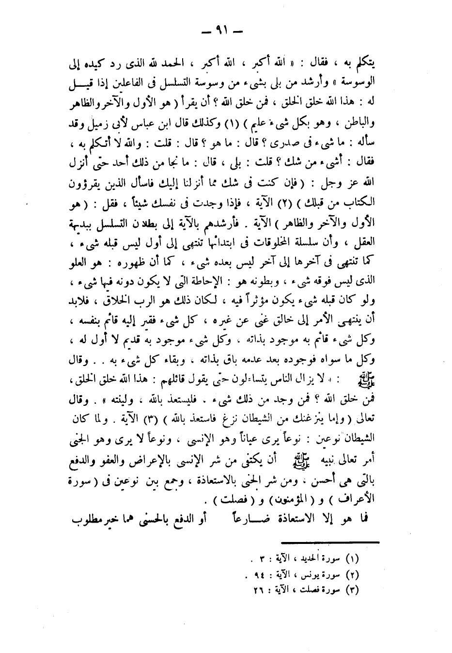 يَتَكَلَّمَ بِهِ، فَقَالَ: اللَّهُ أَكْبَرُ، اللَّهُ أَكْبَرُ، الْحَمْدُ لِلَّهِ الَّذِي رَدَّ كَيْدَهُ إِلَى الْوَسْوَسَةِ.» «وَأَرْشَدَ مَنْ بُلِيَ بِشَيْءٍ مِنْ وَسْوَسَةِ التَّسَلْسُلِ فِي الْفَاعِلِينَ إِذَا قِيلَ لَهُ: هَذَا اللَّهُ خَلَقَ الْخَلْقَ، فَمَنْ خَلَقَ اللَّهَ؟ - أَنْ يَقْرَأَ {هُوَ الْأَوَّلُ وَالْآخِرُ وَالظَّاهِرُ وَالْبَاطِنُ وَهُوَ بِكُلِّ شَيْءٍ عَلِيمٌ} [الحديد: 3] » (¬1) . وكذلك قال ابن عباس لأبي زميل وَقَدْ سَأَلَهُ: مَا شَيْءٌ أَجِدُهُ فِي صَدْرِي؟ قَالَ: مَا هُوَ؟ قَالَ: قُلْتُ: وَاللَّهِ لَا أتكلم به، فقال: أشيء من شك؟ قلت: بلى، قال: مَا نَجَا مِنْ ذَلِكَ أَحَدٌ حَتَّى أَنْزَلَ اللَّهُ عَزَّ وَجَلَّ: {فَإِنْ كُنْتَ فِي شَكٍّ مِمَّا أَنْزَلْنَا إِلَيْكَ فَاسْأَلِ الَّذِينَ يَقْرَءُونَ الْكِتَابَ مِنْ قَبْلِكَ} [يونس: 94] (¬2) الآية، فَإِذَا وَجَدْتَ فِي نَفْسِكَ شَيْئًا، فَقُلْ: {هُوَ الْأَوَّلُ وَالْآخِرُ وَالظَّاهِرُ} [الحديد: 3] الآية. فأرشدهم بالآية إلى بطلان التسلسل بِبَدِيهَةِ الْعَقْلِ، وَأَنَّ سِلْسِلَةَ الْمَخْلُوقَاتِ فِي ابْتِدَائِهَا تَنْتَهِي إِلَى أَوَّلَ لَيْسَ قَبْلَهُ شَيْءٌ، كَمَا تَنْتَهِي فِي آخِرِهَا إِلَى آخِرٍ لَيْسَ بَعْدَهُ شَيْءٌ، كَمَا أَنَّ ظُهُورَهُ: هُوَ الْعُلُوُّ الَّذِي لَيْسَ فَوْقَهُ شَيْءٌ، وَبُطُونَهُ هُوَ: الْإِحَاطَةُ الَّتِي لَا يَكُونُ دُونَهُ فِيهَا شَيْءٌ، وَلَوْ كَانَ قَبْلَهُ شَيْءٌ يَكُونُ مُؤَثِّرًا فِيهِ، لَكَانَ ذَلِكَ هو الرب الخلاق، فلا بد أن ينتهي الأمر إلى خالق غني عن غيره، كل شَيْءٍ فَقِيرٌ إِلَيْهِ، قَائِمٌ بِنَفْسِهِ، وَكُلُّ شَيْءٍ قَائِمٌ بِهِ، مَوْجُودٌ بِذَاتِهِ، وَكُلُّ شَيْءٍ مَوْجُودٌ بِهِ قَدِيمٌ، لَا أَوَّلَ لَهُ، وَكُلُّ مَا سِوَاهُ فَوُجُودُهُ بَعْدَ عَدَمِهِ بَاقٍ بِذَاتِهِ، وَبَقَاءُ كل شيء به، وَقَالَ صَلَّى اللَّهُ عَلَيْهِ وَسَلَّمَ: «لَا يَزَالُ النَّاسُ يَتَسَاءَلُونَ حَتَّى يَقُولَ قَائِلُهُمْ: هَذَا اللَّهُ خَلَقَ الْخَلْقَ، فَمَنْ خَلَقَ اللَّهَ؟ فَمَنْ وَجَدَ من ذلك شيء، فليستعذ بالله، ولينته» . وقال تَعَالَى: {وَإِمَّا يَنْزَغَنَّكَ مِنَ الشَّيْطَانِ نَزْغٌ فَاسْتَعِذْ بِاللَّهِ} [فصلت: 36] (¬3) الآية ولما كان الشيطان نوعين: نوعا يرى عيانا وهو الإنسي، ونوعا لا يرى وهو الجني - أمر الله تعالى نَبِيَّهُ صَلَّى اللَّهُ عَلَيْهِ وَسَلَّمَ أَنْ يَكْتَفِيَ من شر الإنسي بالإعراض والعفو والدفع بالتي هي أحسن، ومن شر الجني بالاستعاذة، وجمع بين نوعين في (سورة الأعراف) و (المؤمنون) و (فصلت) .