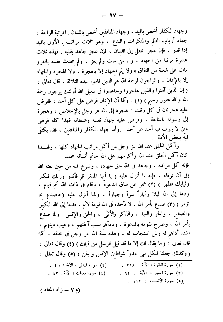 الْكُفَّارِ أَخَصُّ بِالْيَدِ، وَجِهَادُ الْمُنَافِقِينَ أَخَصُّ بِاللِّسَانِ. المرتبة الرابعة: جهاد أرباب الظلم والمنكرات والبدع، وهو ثلاث مَرَاتِبَ: الْأُولَى بِالْيَدِ إِذَا قَدَرَ، فَإِنْ عَجَزَ انْتَقَلَ إِلَى اللِّسَانِ، فَإِنْ عَجَزَ جَاهَدَ بِقَلْبِهِ. فهذه ثلاث عشرة مَرْتَبَةً مِنَ الْجِهَادِ، وَ «مَنْ مَاتَ وَلَمْ يَغْزُ وَلَمْ يُحَدِّثْ نَفْسَهُ بِالْغَزْوِ، مَاتَ عَلَى شعبة من النفاق» . وَلَا يَتِمُّ الْجِهَادُ إِلَّا بِالْهِجْرَةِ، وَلَا الْهِجْرَةُ والجهاد إلا بالإيمان، والراجون لرحمة اللَّهِ هُمُ الَّذِينَ قَامُوا بِهَذِهِ الثَّلَاثَةِ، قَالَ تَعَالَى: {إِنَّ الَّذِينَ آمَنُوا وَالَّذِينَ هَاجَرُوا وَجَاهَدُوا فِي سَبِيلِ اللَّهِ أُولَئِكَ يَرْجُونَ رَحْمَتَ اللَّهِ وَاللَّهُ غَفُورٌ رَحِيمٌ} [الْبَقَرَةِ: 218] (¬1) . وَكَمَا أَنَّ الْإِيمَانَ فَرْضٌ عَلَى كُلِّ أَحَدٍ، فَفَرْضٌ عَلَيْهِ هِجْرَتَانِ فِي كُلِّ وَقْتٍ: هجرة إلى الله عز وجل بالإخلاص، وهجرة إلى رسوله بالمتابعة، وفرض عليه جهاد نفسه وشيطانه فَهَذَا كُلُّهُ فَرْضُ عَيْنٍ لَا يَنُوبُ فِيهِ أَحَدٌ عَنْ أَحَدٍ. وَأَمَّا جِهَادُ الْكُفَّارِ وَالْمُنَافِقِينَ، فقد يكتفى فيه ببعض الأمة.