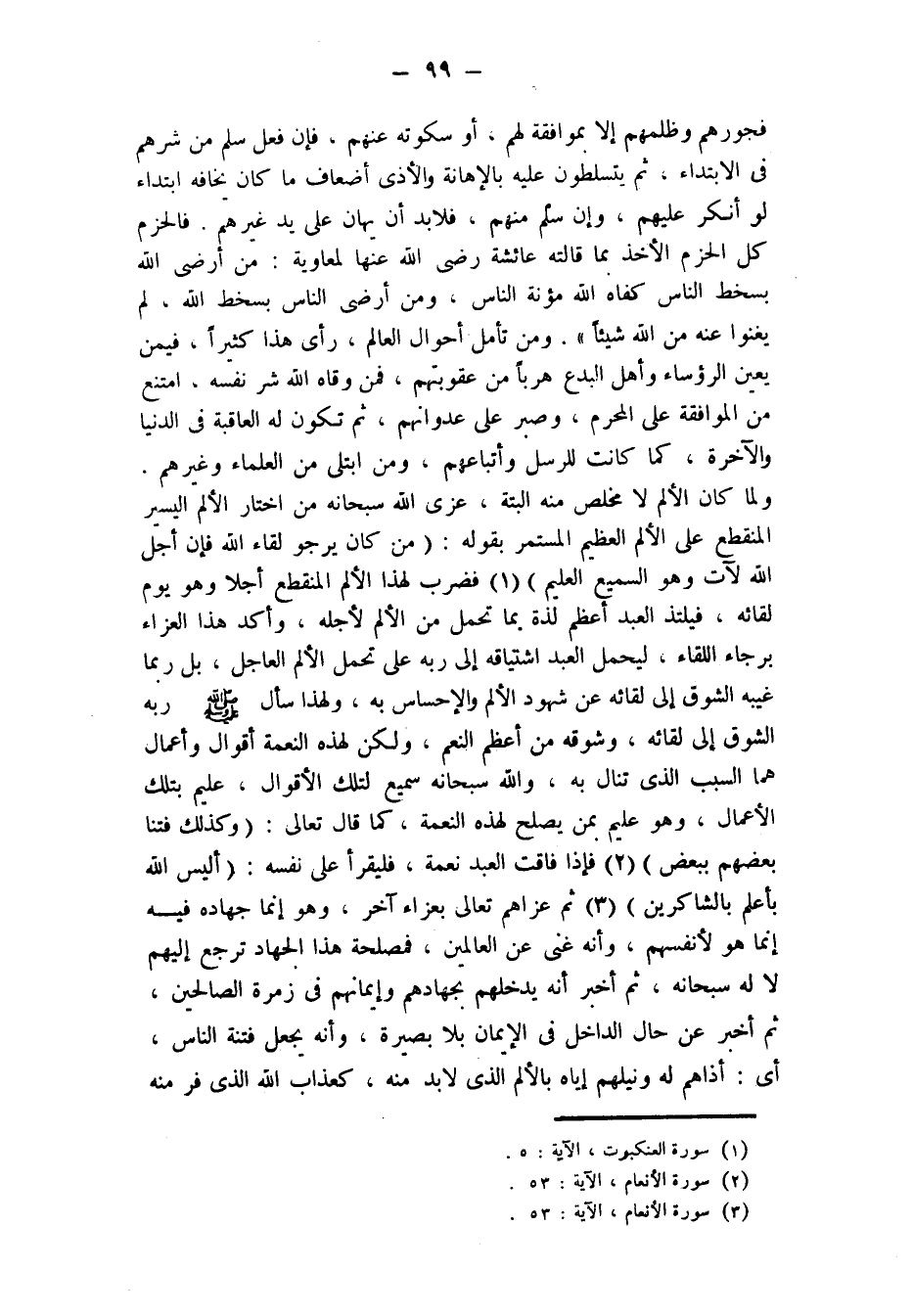 فجورهم وظلمهم إلا بموافقة لهم، أو سكوته عنهم، فإن فعل سَلِمَ مِنْ شَرِّهِمْ فِي الِابْتِدَاءِ، ثُمَّ يَتَسَلَّطُونَ عَلَيْهِ بِالْإِهَانَةِ وَالْأَذَى أَضْعَافَ مَا كَانَ يَخَافُهُ ابتداء لو أنكر عليهم، وَإِنْ سَلِمَ مِنْهُمْ، فَلَا بُدَّ أَنْ يُهَانَ على يد غيرهم. فالحزم كل الحزم: الأخذ بما قالته عائشة رضي الله عنها لمعاوية: مَنْ أَرْضَى اللَّهَ بِسَخَطِ النَّاسِ، كَفَاهُ اللَّهُ مُؤْنَةَ النَّاسِ، وَمَنْ أَرْضَى النَّاسَ بِسَخَطِ اللَّهِ، لَمْ يُغْنُوا عَنْهُ مِنَ اللَّهِ شَيْئًا. وَمَنْ تَأَمَّلَ أَحْوَالَ الْعَالَمِ، رَأَى هَذَا كَثِيرًا، فيمن يعين الرؤساء وأهل البدع هربا من عقوبتهم، فمن وقاه الله شر نفسه، امتنع من الموافقة على المحرم، وصبر على عداوتهم، ثُمَّ تَكُونُ لَهُ الْعَاقِبَةُ فِي الدُّنْيَا وَالْآخِرَةِ، كما كانت للرسل لمن ابتلي من العلماء وغيرهم. ولما كان الألم لا مخلص مِنْهُ الْبَتَّةَ، عَزَّى اللَّهُ سُبْحَانَهُ مَنِ اخْتَارَ الْأَلَمَ الْيَسِيرَ الْمُنْقَطِعَ عَلَى الْأَلَمِ الْعَظِيمِ الْمُسْتَمِرِّ بِقَوْلِهِ: {مَنْ كَانَ يَرْجُو لِقَاءَ اللَّهِ فَإِنَّ أَجَلَ اللَّهِ لَآتٍ وَهُوَ السَّمِيعُ الْعَلِيمُ} [العنكبوت: 5] (¬1) . فضرب لهذا الألم المنقطع أجلا وهو يوم لقائه، فيلتذ العبد أعظم لذة بما تحمل من الألم لأجله، وأكد هذا العزاء برجاء اللقاء؛ ليحمل العبد اشتياقه إلى ربه على تحمل الألم العاجل، بل ربما غيبه الشوق عَنْ شُهُودِ الْأَلَمِ وَالْإِحْسَاسِ بِهِ؛ وَلِهَذَا سَأَلَ صَلَّى اللَّهُ عَلَيْهِ وَسَلَّمَ رَبَّهُ الشَّوْقَ إِلَى لقائه، وشوقه من أعظم النعم، وَلَكِنْ لِهَذِهِ النِّعْمَةِ أَقْوَالٌ وَأَعْمَالٌ هُمَا السَّبَبُ الَّذِي تُنَالُ بِهِ، وَاللَّهُ سُبْحَانَهُ سَمِيعٌ لِتِلْكَ الأقوال، عليم بتلك الأعمال، وهو عليم بمن يصلح لهذه النعمة، كَمَا قَالَ تَعَالَى: {وَكَذَلِكَ فَتَنَّا بَعْضَهُمْ بِبَعْضٍ} [الأنعام: 53] (¬2) فإذا فاقت العبد نعمة، فَلْيَقْرَأْ عَلَى نَفْسِهِ: {أَلَيْسَ اللَّهُ بِأَعْلَمَ بِالشَّاكِرِينَ} [الأنعام: 53] (¬3) . ثُمَّ عَزَّاهُمْ تَعَالَى بِعَزَاءٍ آخَرَ، وَهُوَ إنما جهادهم فيه إنما هو لأنفسهم، وأنه غني عن العالمين، فمصلحة هذا الجهاد ترجع إليهم لا له سُبْحَانَهُ، ثُمَّ أَخْبَرَ أَنَّهُ يُدْخِلُهُمْ بِجِهَادِهِمْ وَإِيمَانِهِمْ فِي زُمْرَةِ الصَّالِحِينَ، ثُمَّ أَخْبَرَ عَنْ حَالِ الداخل في الإيمان بلا بصيرة، وأنه يجعل فتنة الناس - أي أذاهم له ونيلهم إياه بالألم الذي لا بد منه - كعذاب الله الذي فر منه
