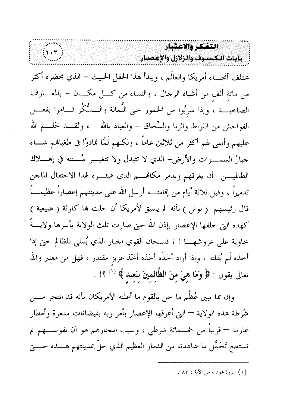 مختلف أنحاء أمريكا والعالَم، ويبدأ هذا الحفل الخبيث - الذي يحضره أكثر من مائةِ ألفٍ من أشباه الرجال، والنساء من كل مكان - بالمعازف الصاخبة، وإذا شَرِبُوا من الخمور حتى الثُّمالة والسُّكْر قاموا بفعل الفواحش من اللواط والزنا والسِّحاق - والعياذ بالله -، ولقد حَلم الله عليهم وأملى لهم أكثر من ثلاثين عاماً، ولكنهم لَمَّا تمادوْا في طغيانهم شاء جبارُ السموات والأرض- الذي لا تتبدل ولا تتغير سُننه في إهلاك الظالمين- أن يغرقهم ويدمر مكانهم الذي هيئوه لهذا الاحتفال الماجن تدميراً، وقبل ثلاثة أيام من إقامته أرسل الله على مدينتهم إعصاراً عظيماً قال رئيسهم (بوش) بأنه لم يسبق لأمريكا أن حلت بها كارثة (طبيعية) كهذه التي خلفها الإعصار بإذن الله حتى صارت تلك الولاية بأسرها ولايةً خاوية على عروشها!؛ فسبحان القوي الجبار الذي يُملي للظالم حتى إذا أخذه لَم يُفلته، وإذا أراد أخْذَه أخَذه أخْذ عزيزٍ مقتدر، فهل من معتبر والله تعالى يقول: {وَمَا هِيَ مِنَ الظَّالِمِينَ بِبَعِيدٍ} (¬1)؟!.