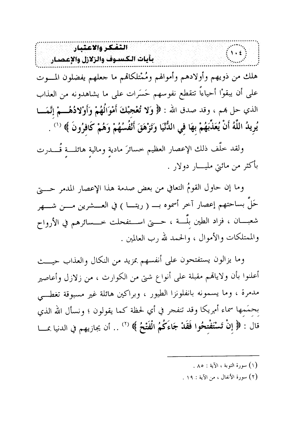وما يزالون يستفتحون على أنفسهم بمزيد من النكال والعذاب حيث أعلنوا بأن ولاياتهم مقبلة على أنواع شتى من الكوارث، من زلازل وأعاصير مدمرة، وما يسمونه بانفلونزا الطيور، وبراكين هائلة غير مسبوقة تغطي بِحِمَمِها سماء أمريكا وقد تنفجر في أي لحظة كما يقولون؛ ونسأل الله الذي قال: {إِنْ تَسْتَفْتِحُوا فَقَدْ جَاءَكُمُ الْفَتْحُ} (¬2) .. أن يجازيهم في الدنيا بما