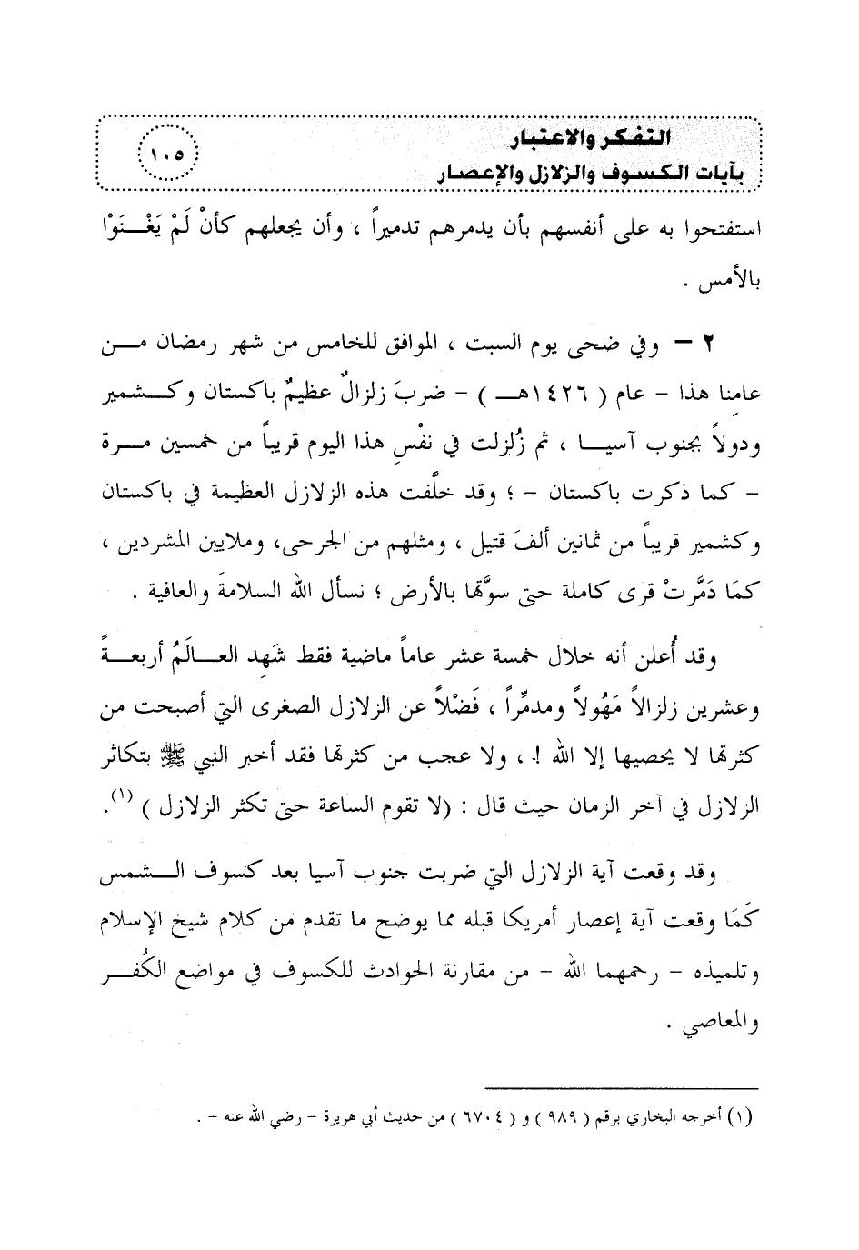 2 – وفي ضحى يوم السبت، الموافق للخامس من شهر رمضان من عامِنا هذا - عام (1426هـ) - ضربَ زلزالٌ عظيمٌ باكستان وكشمير ودولاً بجنوب آسيا، ثم زُلزلت في نفْسِ هذا اليوم قريباً من خمسين مرة - كما ذكرت باكستان -؛ وقد خلَّفت هذه الزلازل العظيمة في باكستان وكشمير قريباً من سبعين ألفَ قتيل، ومثلهم من الجرحى، وملايين المشردين، كمَا دَمَّرتْ قرى كاملة حتى سوَّتها بالأرض؛ نسأل الله السلامةَ والعافية.