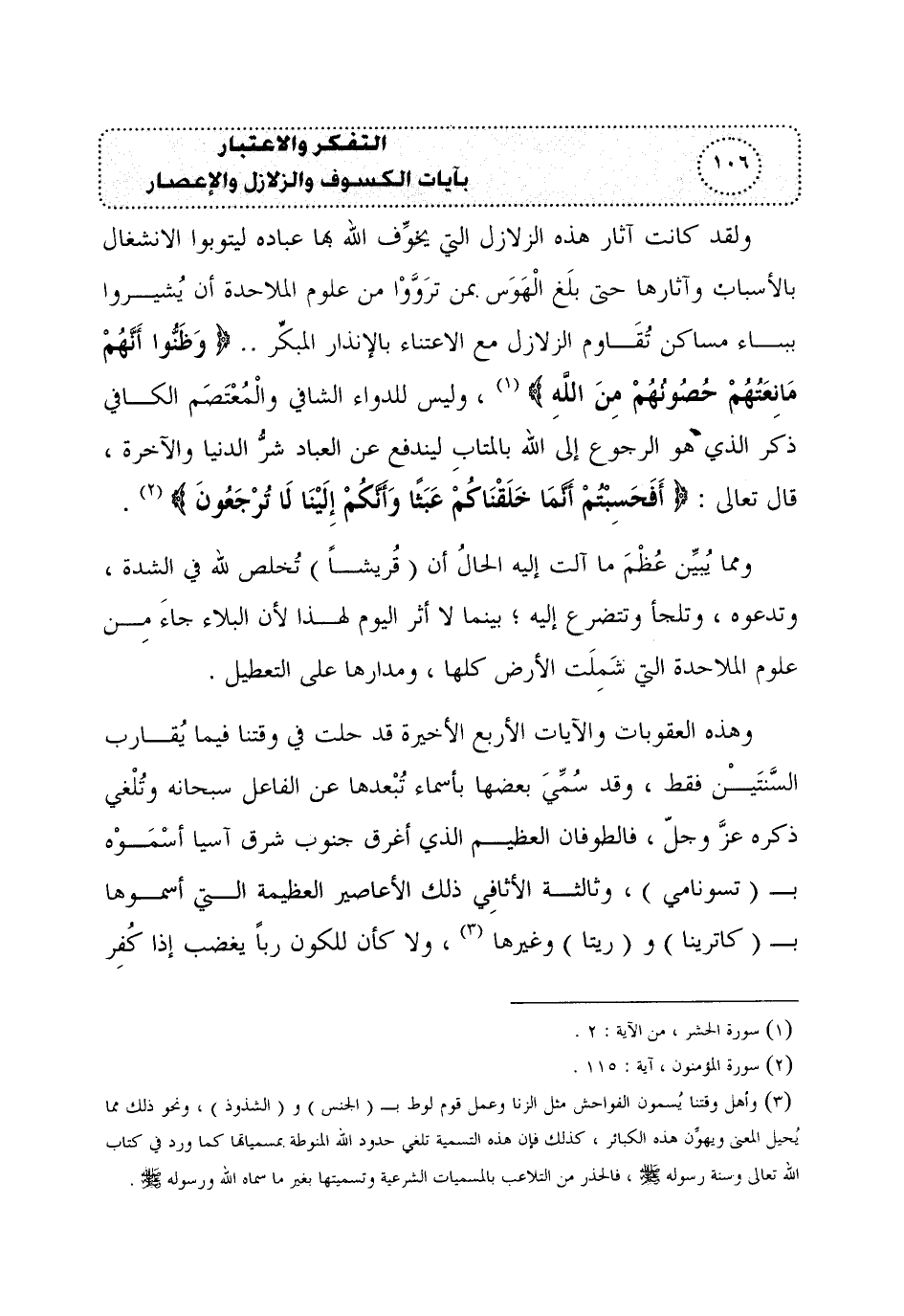 ولقد كانت آثار هذه الزلازل التي يخوِّف الله بها عباده ليتوبوا الانشغال بالأسباب وآثارها حتى بلَغ الْهَوَس بمن ترَوَّوْا من علوم الملاحدة أن يُشيروا ببناء مساكن تُقَاوم الزلازل مع الاعتناء بالإنذار المبكِّر .. {وَظَنُّوا أَنَّهُمْ مَانِعَتُهُمْ حُصُونُهُمْ مِنَ اللَّهِ} (¬1)، وليس للدواء الشافي والْمُعْتَصَم الكافي ذكر الذي هو الرجوع إلى الله بالمتابِ ليندفع عن العباد شرُّ الدنيا والآخرة، قال تعالى: {أَفَحَسِبْتُمْ أَنَّمَا خَلَقْنَاكُمْ عَبَثًا وَأَنَّكُمْ إِلَيْنَا لَا تُرْجَعُونَ} (¬2).
