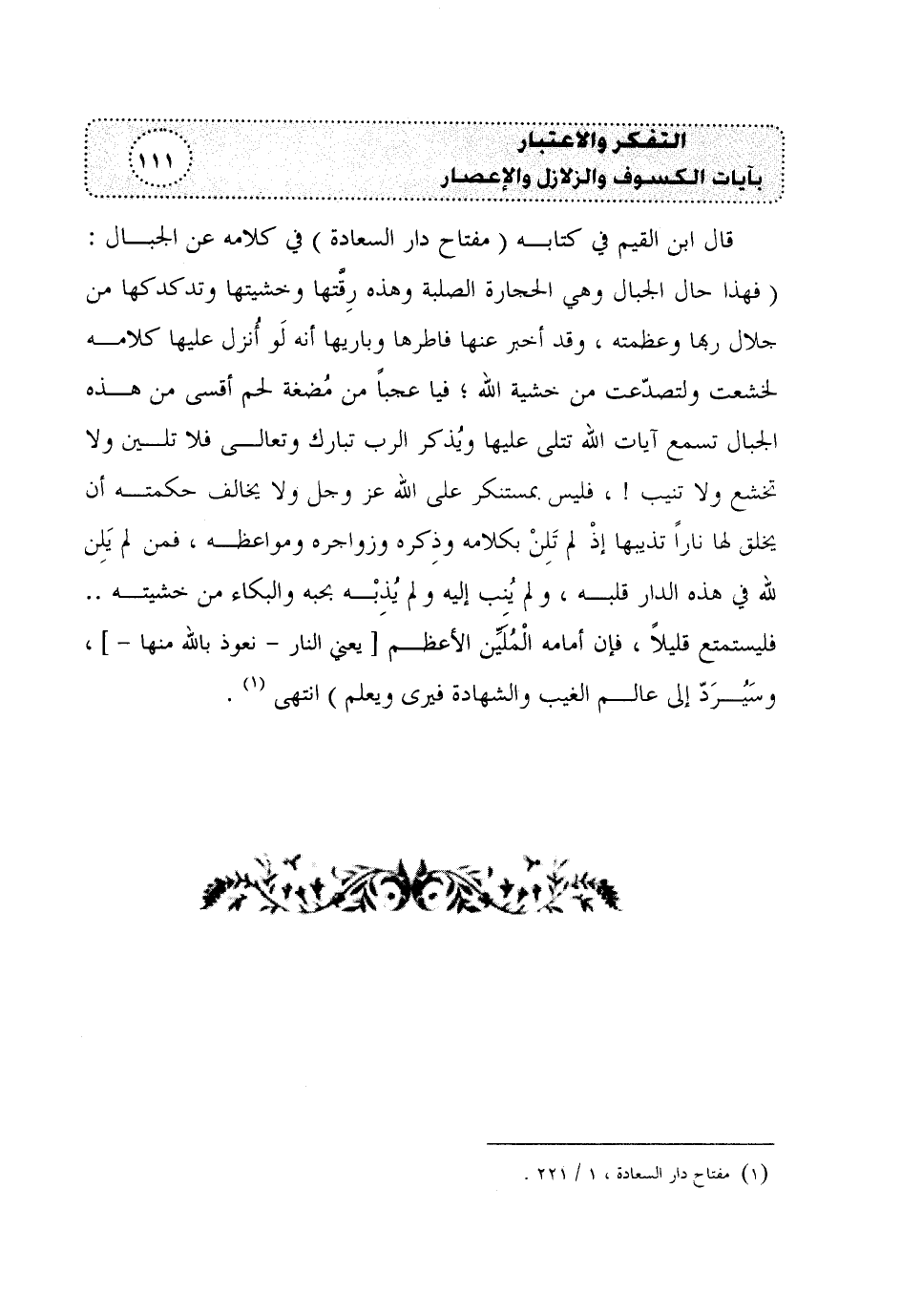 قال ابن القيم في كتابه (مفتاح دار السعادة) في كلامه عن الجبال: (فهذا حال الجبال وهي الحجارة الصلبة وهذه رِقَّتها وخشيتها وتدكدكها من جلال ربها وعظمته، وقد أخبر عنها فاطرها وباريها أنه لَو أُنزل عليها كلامه لخشعت ولتصدّعت من خشية الله؛ فيا عجباً من مُضغة لحم أقسى من هذه الجبال تسمع آيات الله تتلى عليها ويُذكر الرب تبارك وتعالى فلا تلين ولا تخشع ولا تنيب!، فليس بمستنكر على الله عز وجل ولا يخالف حكمته أن يخلق لها ناراً تذيبها إذْ لم تَلِنْ بكلامه وذِكره وزواجره ومواعظه، فمن لم يَلِن لله في هذه الدار قلبه، ولم يُنِب إليه ولم يُذِبْه بحبه والبكاء من خشيته .. فليستمتع قليلاً، فإن أمامه الْمُلَيِّن الأعظم [يعني النار - نعوذ بالله منها -]، وسَيُرَدّ إلى عالم الغيب والشهادة فيرى ويعلم) انتهى (¬1).