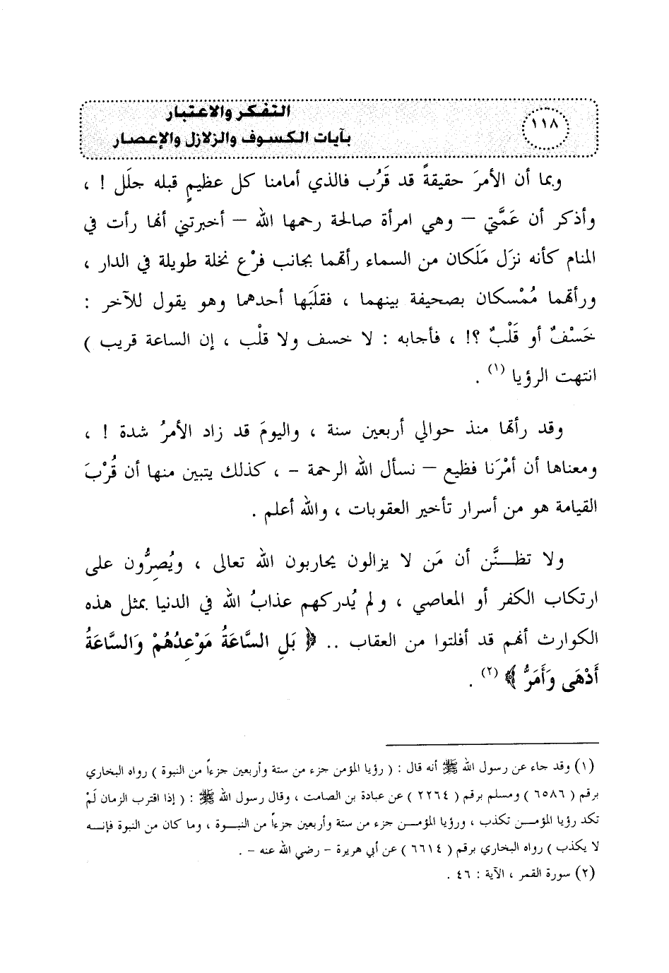 وبما أن الأمرَ حقيقةً قد قَرُب فالذي أمامنا كل عظيمٍ قبله جلَل!، وأذكر أن عَمَّتي – وهي امرأة صالحة رحمها الله – أخبرتني أنها رأت في المنام كأنه نزَل مَلَكان من السماء رأتهما بجانب فرْع نخلة طويلة في الدار، ورأتهما مُمْسكان بصحيفة بينهما، فقلَبَها أحدهما وهو يقول للآخر: خَسْفٌ أو قَلْبٌ؟!، فأجابه: لا خسف ولا قلْب، إن الساعة قريب) انتهت الرؤيا (¬1).