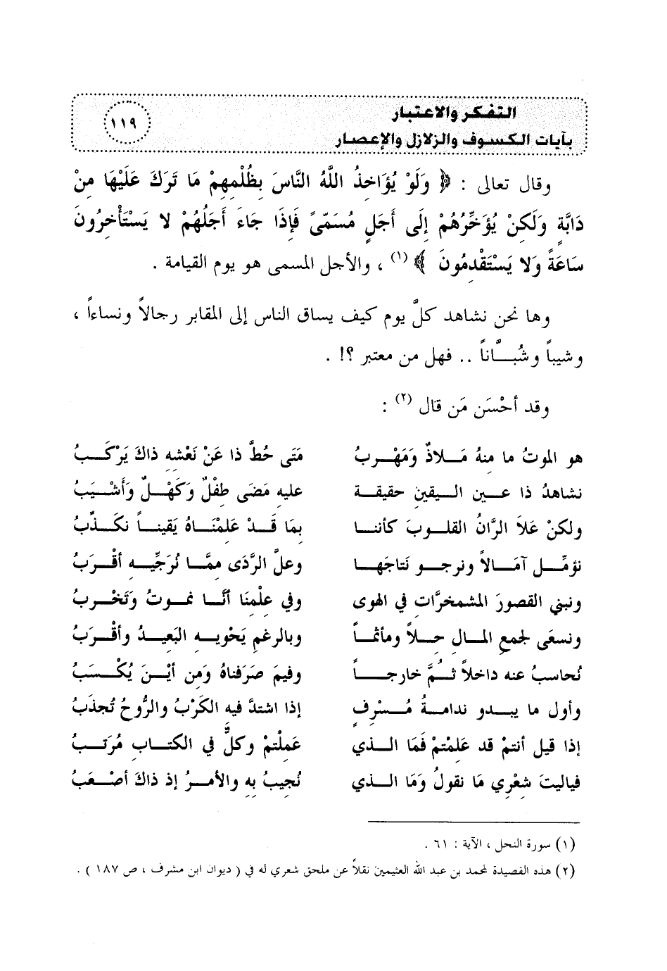 وقال تعالى: {وَلَوْ يُؤَاخِذُ اللَّهُ النَّاسَ بِظُلْمِهِمْ مَا تَرَكَ عَلَيْهَا مِنْ دَابَّةٍ وَلَكِنْ يُؤَخِّرُهُمْ إِلَى أَجَلٍ مُسَمّىً فَإِذَا جَاءَ أَجَلُهُمْ لا يَسْتَأْخِرُونَ سَاعَةً وَلا يَسْتَقْدِمُونَ} (¬1)، والأجل المسمى هو يوم القيامة.