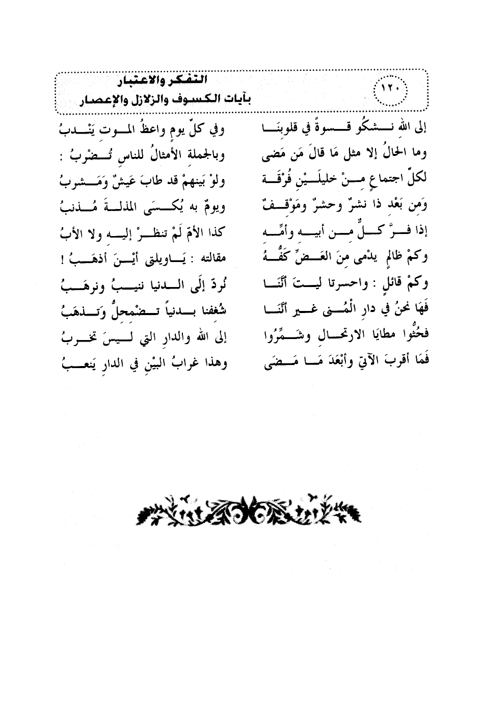 وما الحالُ إلا مثل مَا قالَ مَن مَضى لكلِّ اجتماعٍ مِنْ خليلَيْنِ فُرْقَة ... وَمِن بَعْدِ ذا نشرٌ وحشرٌ ومَوْقِفٌ ... إذا فرَّ كلٌّ مِن أبيهِ وأمِّهِ ... وكمْ ظالمٍ يدْمى مِنَ العَضِّ كَفُّهُ ... وكمْ قائلٍ: واحسرتا ليتَ أنَّنَا ... فَهَا نحنُ في دارِ الْمُنى غير أنَّنَا ... فحُثُّوا مطايَا الارتحالِ وشَمِّرُوا ... فَمَا أقربَ الآتي وأبْعَدَ مَا مَضَى ... .