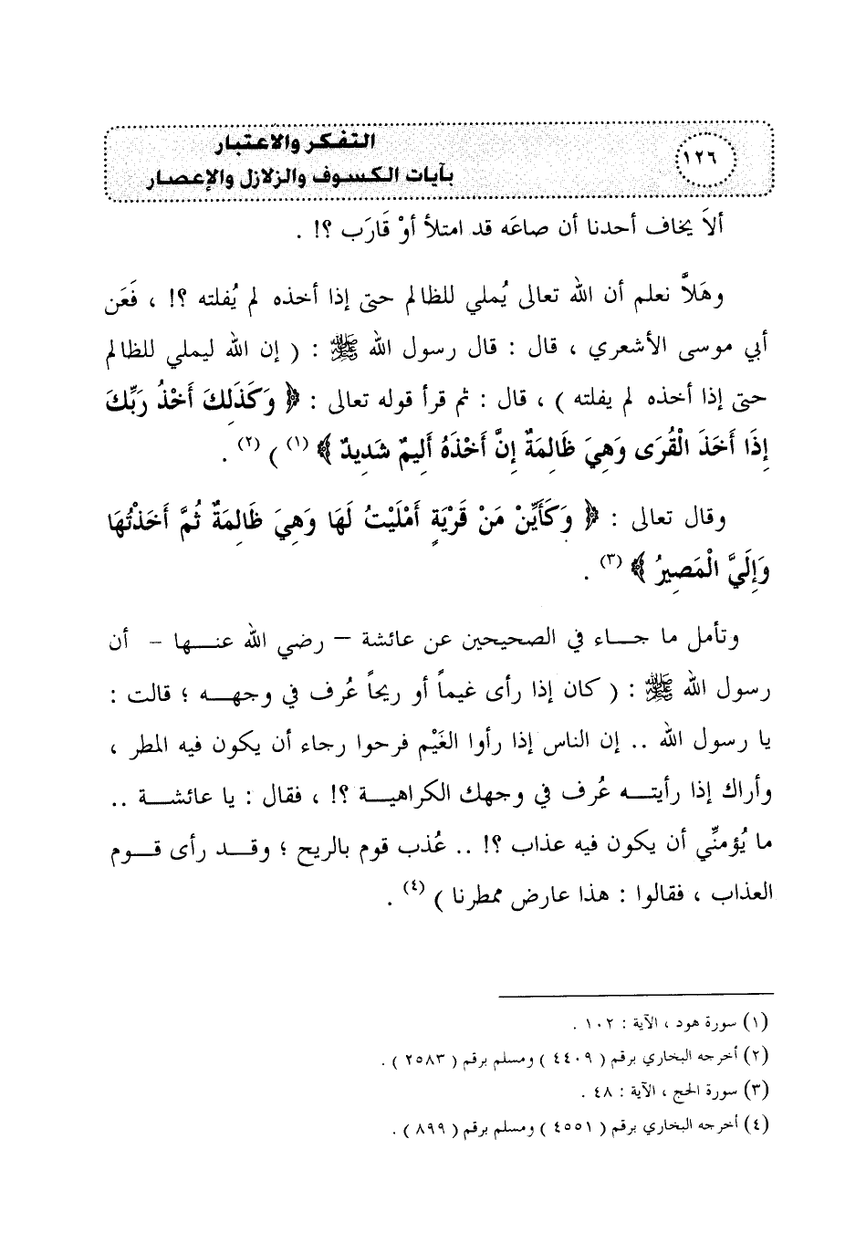 وتأمل ما جاء في الصحيحين عن عائشة – رضي الله عنها - أن رسول الله - صلى الله عليه وسلم -: (كان إذا رأى غيماً أو ريحاً عُرف في وجهه؛ قالت: يا رسول الله .. إن الناس إذا رأوا الغَيْم فرحوا رجاء أن يكون فيه المطر، وأراك إذا رأيته عُرف في وجهك الكراهية؟!، فقال: يا عائشة .. ما يُؤمنِّي أن يكون فيه عذاب؟! .. عُذب قوم بالريح؛ وقد رأى قوم العذاب، فقالوا: هذا عارض ممطرنا) (¬4).