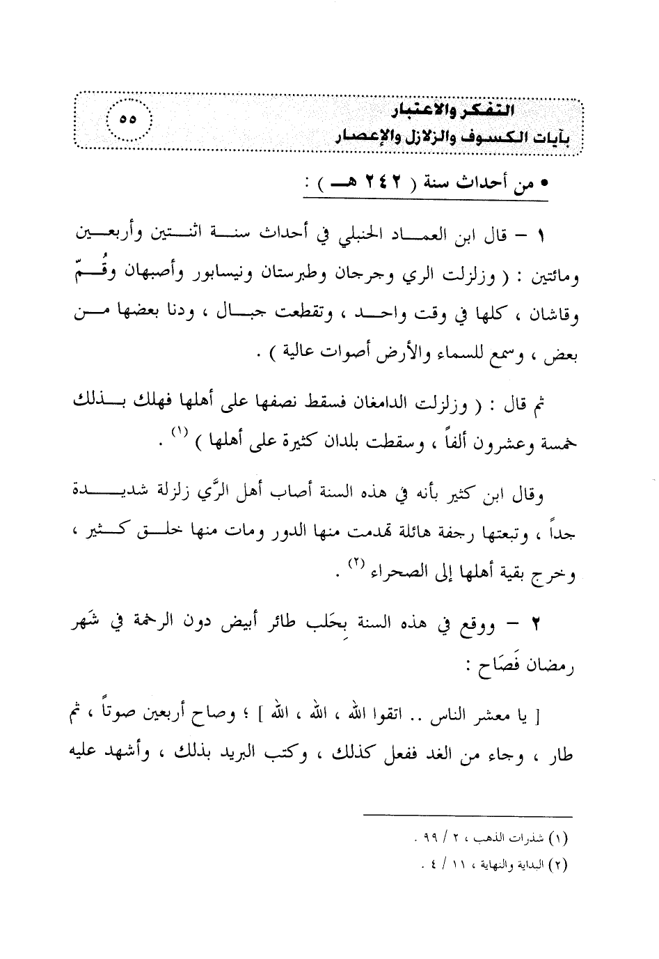 1 - قال ابن العماد الحنبلي في أحداث سنة اثنتين وأربعين ومائتين: (وزلزلت الري وجرجان وطبرستان ونيسابور وأصبهان وقُمّ وقاشان، كلها في وقت واحد، وتقطعت جبال، ودنا بعضها من بعض، وسمع للسماء والأرض أصوات عالية).