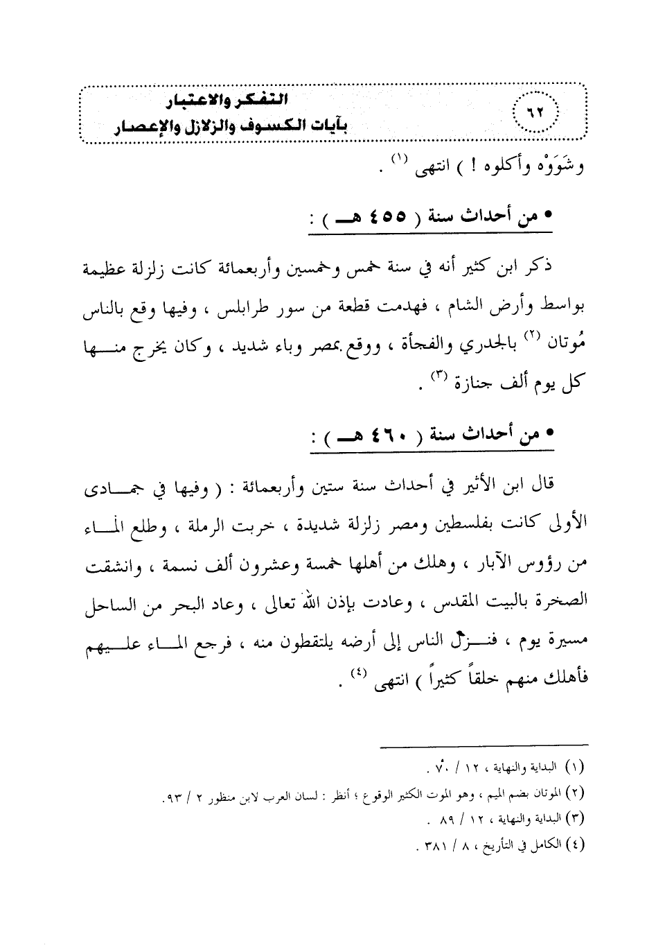 قال ابن الأثير في أحداث سنة ستين وأربعمائة: (وفيها في جمادى الأولى كانت بفلسطين ومصر زلزلة شديدة، خربت الرملة، وطلع الماء من رؤوس الآبار، وهلك من أهلها خمسة وعشرون ألف نسمة، وانشقت الصخرة بالبيت المقدس، وعادت بإذن الله تعالى، وعاد البحر من الساحل مسيرة يوم، فنزل الناس إلى أرضه يلتقطون منه، فرجع الماء عليهم فأهلك منهم خلقاً كثيراً) انتهى (¬4).