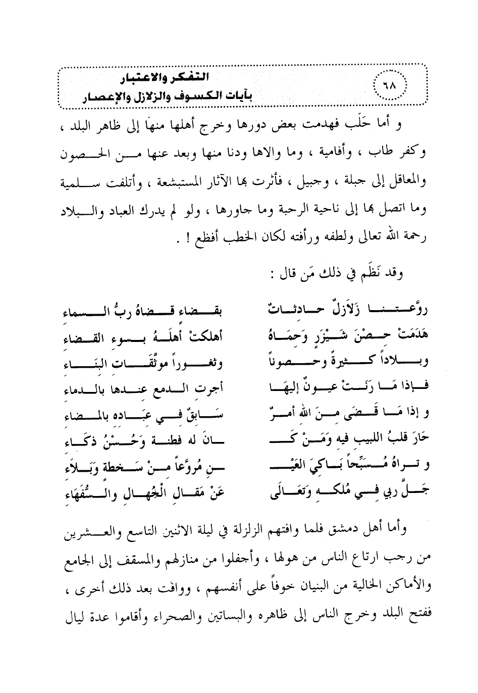 روَّعتنا زَلاَزلٌ حادِثاتٌ ... هَدَمَتْ حِصْنَ شَيْزَرٍ وَحِمَاهُ ... وبلاداً كثيرةً وحصوناً ... فإذا مَا رَنَتْ عيونٌ إليهَا ... وإذا مَا قَضَى مِنَ اللهِ أمرٌ ... حَارَ قلبُ اللبيبِ فيهِ وَمَنْ كَـ ... وتراهُ مُسَبِّحاً بَاكِيَ العَيْـ ... جَلَّ ربي فِي مُلكهِ وَتعَالَى ... . ... بقضاءٍ قضاهُ ربُّ السماءِ ... أهلكتْ أهلَهُ بسوءِ القضاءِ ... وثغوراً موثَّقَاتِ البِنَاءِ ... أجرتِ الدمع عِندها بالدماءِ ... سَابِقٌ فِي عِبَادِهِ بالمضاءِ ... ـانَ له فطنة وَحُسْنُ ذكَاءِ ... ـنِ مُروَّعاً مِنْ سَخطةٍ وَبَلاَءِ ... عَنْ مَقالِ الْجُهالِ والسُّفَهَاءِ ... .
