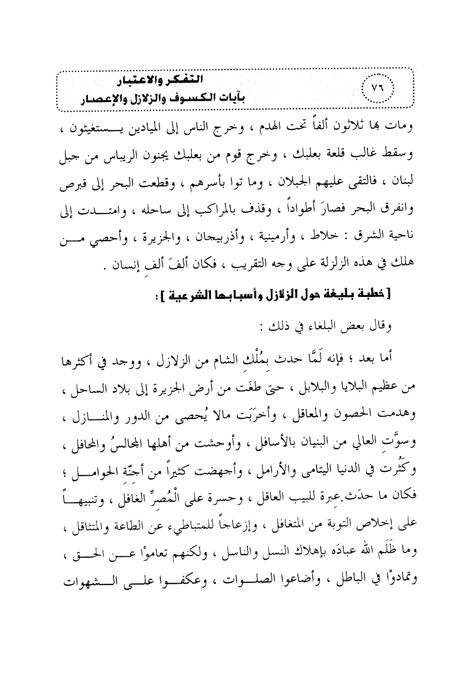 أما بعد؛ فإنه لَمَّا حدث بِمُلْكِ الشام من الزلازل، ووجد في أكثرها من عظيم البلايا والبلابل، حتى طغَت من أرض الجزيرة إلى بلاد الساحل، وهدمت الحصون والمعاقل، وأخرَبَت مالا يُحصى من الدور والمنازل، وسوَّتِ العالي من البنيان بالأسافل، وأوحشت من أهلها المجالسُ والمحافل، وكَثُرت في الدنيا اليتامى والأرامل، وأجهضت كثيراً من أجِنّةِ الحوامل؛ فكان ما حدَث عِبرة للبيب العاقل، وحسرة على الْمُصِرِّ الغافل، وتنبيهاً على إخلاص التوبة من المتغافل، وإزعاجاً للمتباطيء عن الطاعة والمتثاقل، وما ظَلَم الله عبادَه بإهلاك النسل والناسل، ولكنهم تعاموْا عن الحق، وتمادوْا في الباطل، وأضاعوا الصلوات، وعكفوا على الشهوات