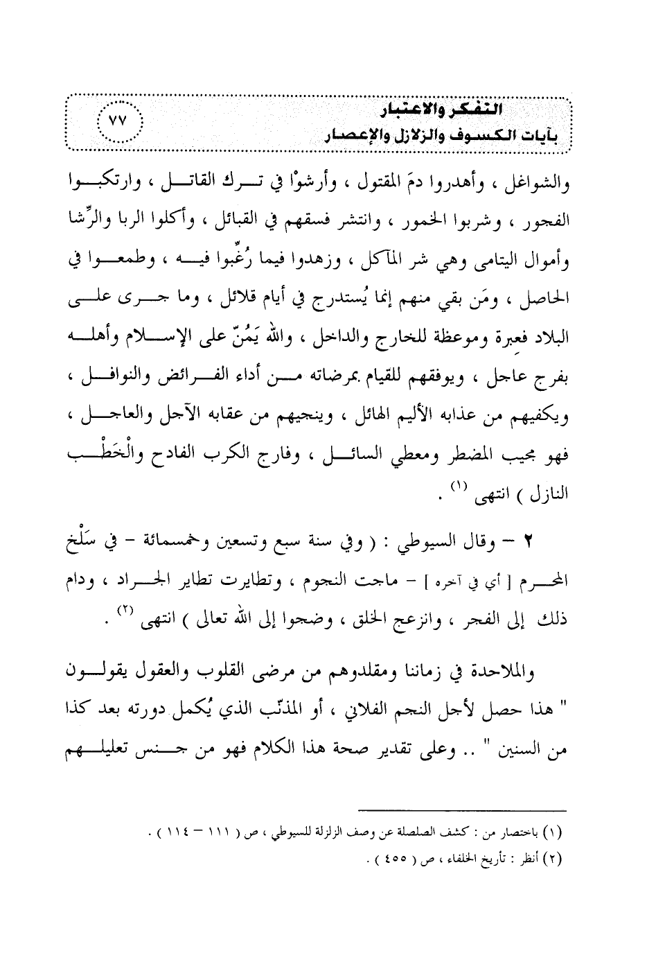 2 - وقال السيوطي: (وفي سنة سبع وتسعين وخمسمائة - في سَلْخ المحرم [أي في آخره]- ماجت النجوم، وتطايرت تطاير الجراد، ودام ذلك إلى الفجر، وانزعج الخلق، وضجوا إلى الله تعالى) انتهى (¬2).