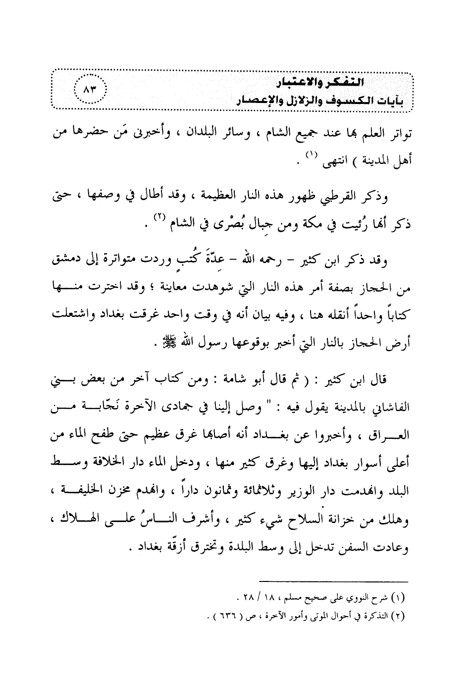 وذكر القرطبي ظهور هذه النار العظيمة، وقد أطال في وصفها، حتى ذكر أنها رُئيت في مكة ومن جِبال بُصْرى في الشام (¬2).