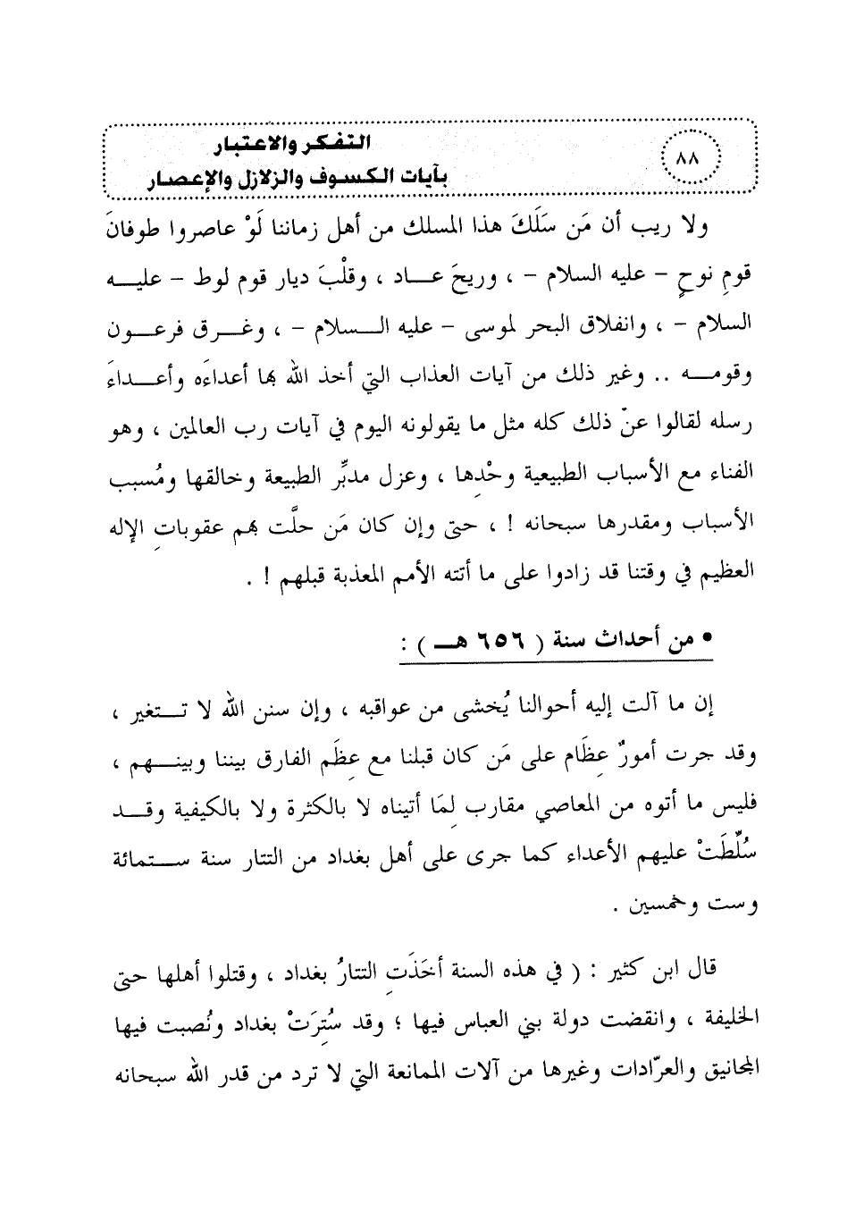 إن ما آلت إليه أحوالنا يُخشى من عواقبه، وإن سنن الله لا تتغير، وقد جرت أمورٌ عِظَام على مَن كان قبلنا مع عِظَم الفارق بيننا وبينهم، فليس ما أتوه من المعاصي مقارب لِمَا أتيناه لا بالكثرة ولا بالكيفية وقد سُلِّطَتْ عليهم الأعداء كما جرى على أهل بغداد من التتار سنة ستمائة وست وخمسين.