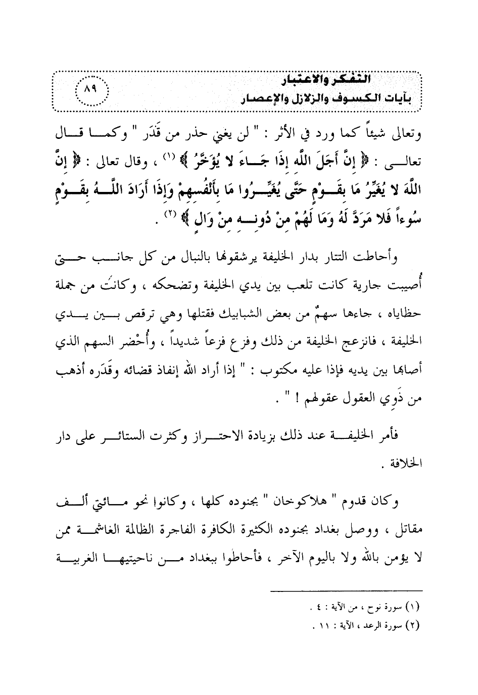 وكان قدوم " هلاكوخان " بجنوده كلها، وكانوا نحو مائتي ألف مقاتل، ووصل بغداد بجنوده الكثيرة الكافرة الفاجرة الظالمة الغاشمة ممن لا يؤمن بالله ولا باليوم الآخر، فأحاطوا ببغداد من ناحيتيها الغربية