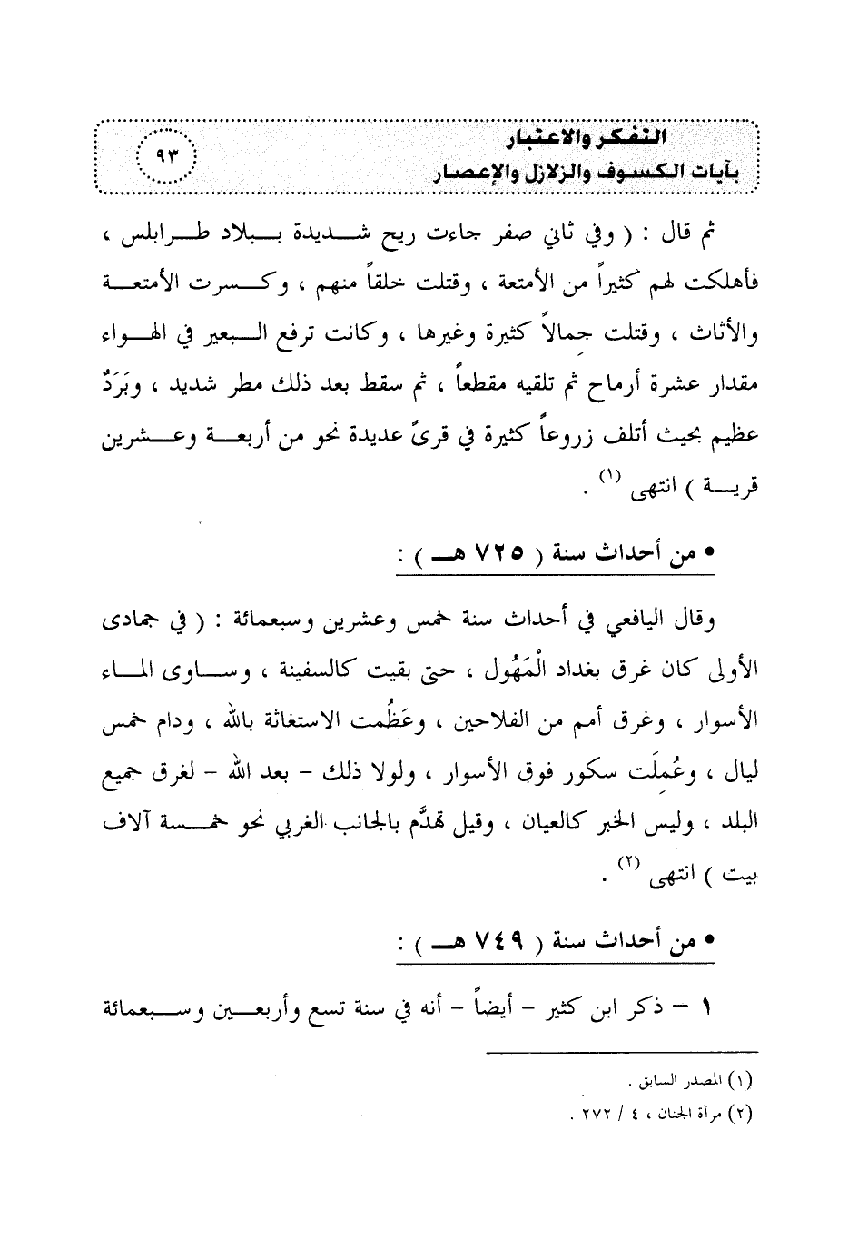 ثم قال: (وفي ثاني صفر جاءت ريح شديدة ببلاد طرابلس، فأهلكت لهم كثيراً من الأمتعة، وقتلت خلقاً منهم، وكسرت الأمتعة والأثاث، وقتلت جِمالاً كثيرة وغيرها، وكانت ترفع البعير في الهواء مقدار عشرة أرماح ثم تلقيه مقطعاً، ثم سقط بعد ذلك مطر شديد، وبَرَدٌ عظيم بحيث أتلف زروعاً كثيرة في قرىً عديدة نحو من أربعة وعشرين قرية) انتهى (¬1).