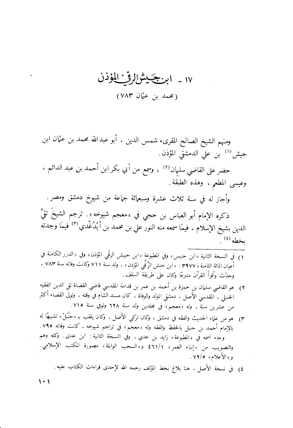 وَمِنْهُم الشَّيْخ الامام الْعَالم الْمُحدث الْمُفِيد الزَّاهِد العابد محب الدّين ابو مُحَمَّد عبد الله ابْن الْمسند الْعَالم أبي الْعَبَّاس احْمَد بن الشَّيْخ محب الدّين أبي مُحَمَّد عبد الله بن احْمَد بن أبي بكر مُحَمَّد بن ابراهيم بن احْمَد بن عبد الرَّحْمَن بن اسماعيل بن مَنْصُور الْمَقْدِسِي الصَّالِحِي ولد يَوْم الاحد ثَانِي عشر الْمحرم سنة اثْنَيْنِ وَثَمَانِينَ وسِتمِائَة بصالحية دمشق وَسمع بإفادة أَبِيه من ابْن البُخَارِيّ وَزَيْنَب ابْنة مكي وَخلق وَطلب هُوَ لنَفسِهِ فَأكْثر ومشيخته نَحْو ألف شيخ وَأفَاد كثيرا واستفاد وَخرج لنَفسِهِ وَلغيره من ذَوي الاسناد وَحدث كثيرا وَسمع مِنْهُ جم غفير وَتُوفِّي فِي يَوْم الِاثْنَيْنِ سَابِع شهر ربيع الاول سنة سبع وَثَلَاثِينَ وَسَبْعمائة وَدفن بِالْقربِ من الشَّيْخ موفق الدّين بسفح قاسيون وَذكره الذَّهَبِيّ فِي مُعْجَمه الْمُخْتَص بالمحدثين وَقَالَ انتقيت لَهُ جُزْءا وَهُوَ شيخ الحَدِيث بالضيائية حدث بالكثير انْتهى كَانَ الشَّيْخ تَقِيّ الدّين ابْن تَيْمِية يُحِبهُ وَيُحب قِرَاءَته وجدت بِخَطِّهِ فِي مَوَاضِع تَرْجَمَة الشَّيْخ تَقِيّ الدّين بشيخ الاسلام مِنْهَا فِي اثبات سَماع اولاده من ذَلِك مَا صورته وَحضر وَلَدي مُحَمَّد جبره الله فِي السّنة الثَّالِثَة بِقِرَاءَتِي يَوْم ختم الصَّحِيح على الْمَشَايِخ السَّبْعَة سيدنَا وَشَيخنَا الامام الْعَلامَة الْحَافِظ الْقدْوَة الْحجَّة الْعُمْدَة الزَّاهِد الْوَرع بَقِيَّة الْأَئِمَّة الاعلام وَشَيخ مَشَايِخ الاسلام مفتي فرق الْمُسلمين حجَّة الْمذَاهب فريد الْعَصْر وأوحد الدَّهْر علم الْهدى نَاصِر السّنَن قامع الْبدع تَقِيّ الدّين ابي الْعَبَّاس احْمَد بن عبد الْحَلِيم بن عبد السَّلَام بن عبد الله ابْن أبي الْقَاسِم بن مُحَمَّد ابْن تَيْمِية وَذكر بَقِيَّة السماع وانه كَانَ يَوْم الِاثْنَيْنِ الثَّالِث من ذِي الْحجَّة سنة ارْبَعْ عشرَة وَسَبْعمائة بِالْمَدْرَسَةِ الحنبلية دَاخل دمشق وَوجدت أَيْضا بِخَط الشَّيْخ محب الدّين الْمَذْكُور مَا نَصه وَسمع إبناي مُحَمَّد