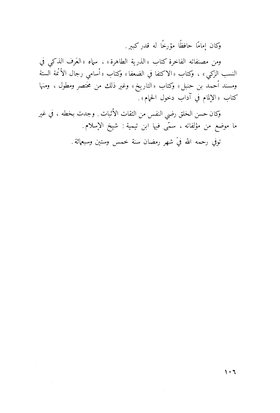 وَمِنْهُم الشَّيْخ الامام الْعَلامَة الزَّاهِد الْقدْوَة الْبركَة الْحَافِظ الْعُمْدَة الثِّقَة الْحجَّة واعظ الْمُسلمين مُفِيد الْمُحدثين زين الدّين أَبُو الْفرج عبد الرَّحْمَن ابْن الشَّيْخ الامام الْمُقْرِئ الْمُحدث شهَاب الدّين أبي الْعَبَّاس احْمَد بن رَجَب وَعبد الرَّحْمَن بن الْحسن بن مُحَمَّد بن أبي البركات مَسْعُود الْبَغْدَادِيّ الدِّمَشْقِي الْحَنْبَلِيّ أحد الْأَئِمَّة الزهاد وَالْعُلَمَاء الْعباد سمع من مُحَمَّد بن الخباز وابراهيم بن دَاوُد الْعَطَّار والميدومي وَأبي الحزم بن القلانسي وَخلق من رُوَاة الْآثَار لَهُ مصنفات مفيدة ومؤلفات عديدة مِنْهَا شرح جَامع التِّرْمِذِيّ أبي عِيسَى وَشرح من أول صَحِيح البُخَارِيّ الى الْجَنَائِز شرحا نفيسا وَله كتاب طَبَقَات أَصْحَاب مذْهبه جعله ذيلا على من بَدَأَ بِهِ وَهُوَ القَاضِي أَبُو الْحُسَيْن مُحَمَّد ابْن القَاضِي أبي يعلى مُحَمَّد بن الْحُسَيْن ابْن الْفراء قَالَ فِيهِ أَحْمد ابْن عبد الْحَلِيم بن عبد السَّلَام بن عبد الله بن أبي الْقَاسِم الْخضر بن مُحَمَّد ابْن تَيْمِية الْحَرَّانِي ثمَّ الدِّمَشْقِي الامام الْفَقِيه الْمُجْتَهد الْمُحدث الْحَافِظ الْمُفَسّر الاصولي الزَّاهِد تَقِيّ الدّين أَبُو الْعَبَّاس شيخ الاسلام وَعلم الاعلام وشهرته تغني عَن الإطناب فِي ذكره والاسهاب فِي أمره ثمَّ ذكر ابْن رَجَب تَرْجَمَة الشَّيْخ تَقِيّ الدّين وفيهَا ذكر مَوته وَدَفنه ثمَّ قَالَ وَصلى عَلَيْهِ صَلَاة الْغَائِب فِي غَالب بِلَاد الاسلام الْقَرِيبَة والبعيدة حَتَّى فِي الْيمن والصين وَأخْبر المسافرون أَنه نُودي بأقصى الصين للصَّلَاة عَلَيْهِ يَوْم الْجُمُعَة الصَّلَاة على ترجمان الْقُرْآن