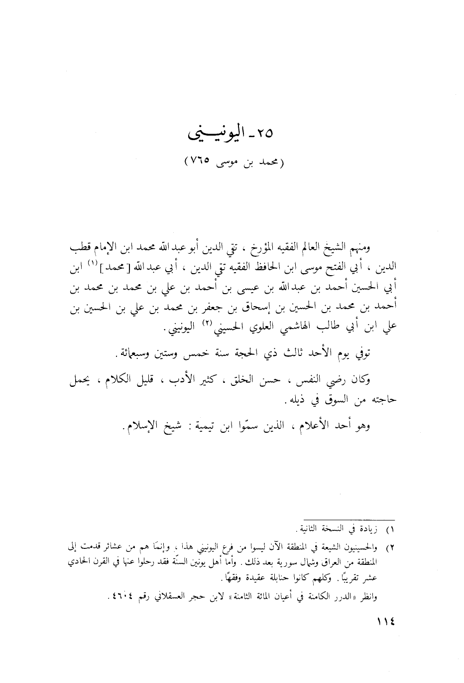 وَمِنْهَا شَيخنَا الامام شيخ الاسلام مُجْتَهد الْعَصْر نادره الْوَقْت فَقِيه الدُّنْيَا سراج الدّين خَاتِمَة الْمُجْتَهدين أَبُو حَفْص عمر بن رسْلَان بن أبي المظفر نصير بن أبي التقى صَالح وَهُوَ أول من سكن بلقين بن حمد بن مُحَمَّدًا ابْن عبد الْحق بن مُسَافر الْكِنَانِي البُلْقِينِيّ امام الْأَئِمَّة وعالم الامة ولد فِي شعْبَان أَربع وَعشْرين وَسَبْعمائة وَتُوفِّي سنة خمس وَثَمَانمِائَة حدث عَن طَائِفَة من الشُّيُوخ سَمَاعا وَعَن آخَرين إجَازَة مِنْهُم مَا قَالَ فِي أَرْبَعِينَ حَدِيثا خرجت لَهُ فَحدث بهَا قَالَ انبانا الشَّيْخ الإِمَام الْمسند الثِّقَة أَبُو الْفرج عبد الرَّحْمَن بن الامام شهَاب الدّين عبد الْحَلِيم ابْن شيخ الْإِسْلَام أبي البركات عبد السَّلَام بن عبد الله ابْن أبي الْقَاسِم ابْن تَيْمِية الْحَرَّانِي إجَازَة من دمشق وَأَجَازَ لي آخَرُونَ قَالُوا انبأنا احْمَد بن عبد الدَّائِم ثمَّ حول الْمسند وَوَصله وَمَا قبله الى الْحسن بن عَرَفَة فروى من جزئه حَدِيثا وَقَالَ عقيبة شَيخنَا هَذَا ولد بحران سنة ثَلَاث وَسِتِّينَ وسِتمِائَة وَسمع من ابْن عبد الدَّائِم وَمن ابْن أبي الْيُسْر وَابْن أبي عمر وَالْفَخْر عَليّ وَجَمَاعَة يزِيدُونَ على الْمِائَة وَكَانَ عَالما فَاضلا دينا ثِقَة وَتفرد وَعلا سَنَده وَعمر وَحدث بالكثير توفّي لَيْلَة الْخَمِيس ثَالِث ذِي الْقعدَة سنة سبع وَأَرْبَعين وَسَبْعمائة وَهُوَ أَخُو الشَّيْخ تَقِيّ الدّين الإِمَام رحمهمَا الله تَعَالَى انْتهى وَلما قدم شَيخنَا شيخ الْإِسْلَام البُلْقِينِيّ رَحْمَة الله عَلَيْهِ دمشق مَعَ السُّلْطَان الْملك الظَّاهِر أبي سعيد والقى الدُّرُوس بمحراب الْحَنَفِيَّة من جَامع دمشق ذكر فِي بعض دروسه مَسْأَلَة لم يرهَا لغيره فاستطرد وَحكى فِيمَا ذكره لي بعض من كَانَ حَاضرا من الْأَئِمَّة قَالَ سمعته يَقُول كَانَ شيخ الْإِسْلَام ابْن تَيْمِية مرّة يلقِي درسا فَذكر مَسْأَلَة قَالَ عَنْهَا هَذِه مَسْأَلَة لَيست فِي كتاب فَقَالَ بعض من كَانَ يناوئه وَلم يسمه هَذِه فِي الف كتاب فَكَانَ شيخ الاسلام ابْن تَيْمِية اذا عرضت تِلْكَ المسأله فِي دروسه يَقُول هَذِه لَيست فِي كتاب ثمَّ يَقُول وَقَالَ الْكذَّاب هَذِه فِي الف كتاب