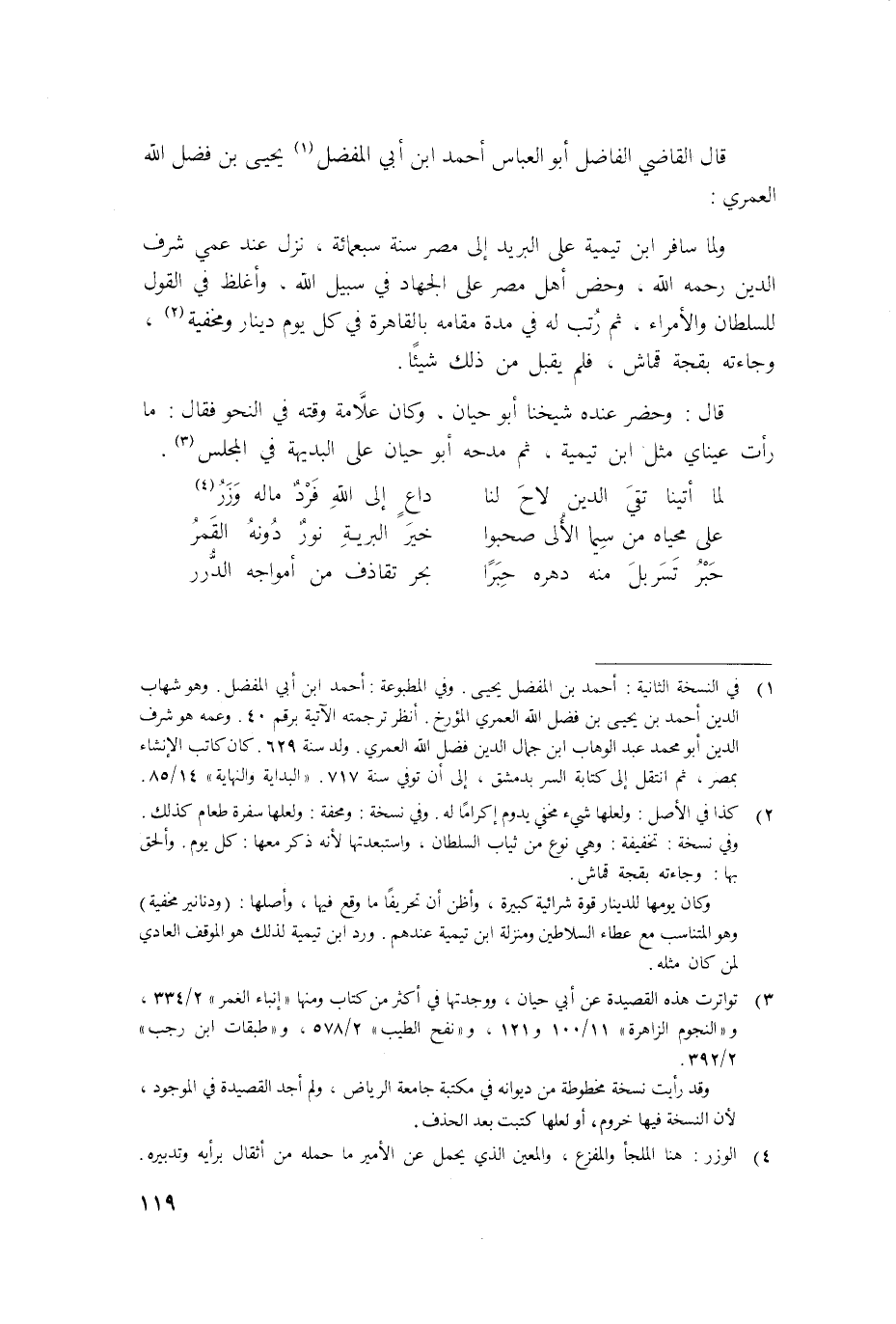 وَمِنْهُم الشَّيْخ الصَّالح الْعَالم العابد الزَّاهِد كَمَال الدّين أَبُو حَفْص عمر بن الياس بن يُونُس المراغي قدم دمشق فِي جُمَادَى الاولى سنة تسع وَعشْرين وَسَبْعمائة وَكَانَ عمره اذ ذَاك نيفا وَثَمَانِينَ سنة فَنزل بدار الحَدِيث الأشرفية دَاخل دمشق بعد ان كَانَ مجاورا بالقدس الشريف ثَلَاثِينَ سنة واقام بِمصْر خمس عشرَة سنة فِيمَا ذكره الْعَلامَة الْحَافِظ أَبُو الفدا اسماعيل بن كثير قَالَ وَهُوَ شيخ حسن المنظر ظَاهر الْوَضَاءَة عَلَيْهِ سيماء الْعِبَادَة ولديه علم وَتَحْقِيق وَذكر أَنه سَأَلَهُ عَن الشَّيْخ تَقِيّ الدّين ابْن تَيْمِية فَقَالَ هُوَ عِنْدِي رجل كَبِير الْقدر عَالم مُجْتَهد شُجَاع صَاحب حق كثير الرَّد على هَؤُلَاءِ الحلولية والإتحادية والإنية وَاجْتمعت بِهِ مرَارًا وشكرته على ذَلِك وَكَانَ أهل هَذَا الْمَذْهَب الْخَبيث يخَافُونَ مِنْهُ كثيرا وَكَانَ يَقُول لي أَلا تكون مثلي فَأَقُول لَهُ لَا استطيع