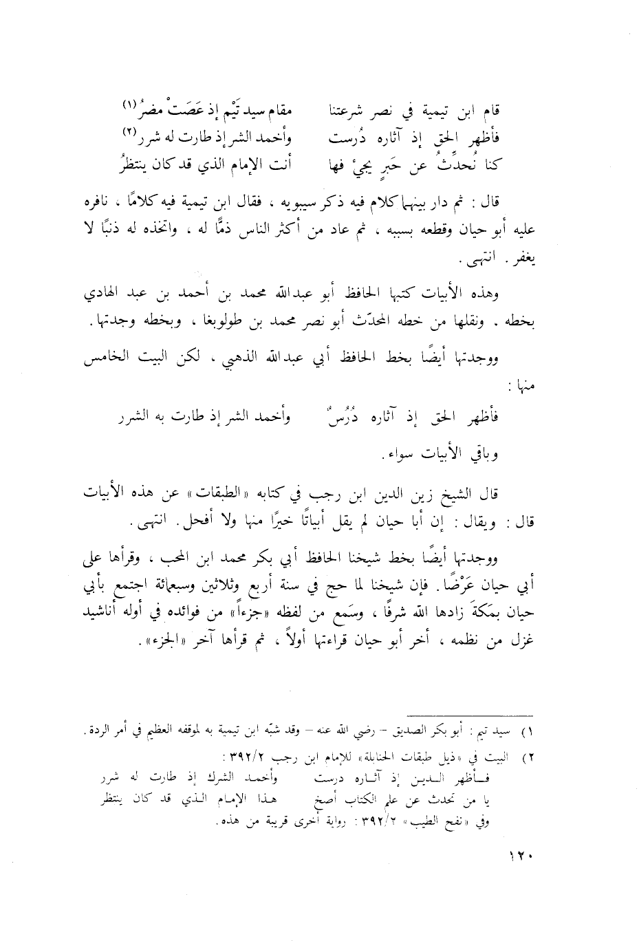 فَكَانَ إِذا قَرَأَهُ يبكي ويرق قلبه فَمَاتَ محرما بخليص كَمَا تقدم وَسمعت بعض مَشَايِخنَا يذكر أَن الْحفاظ الثَّلَاثَة الْمزي والذهبي والبرزالي اقتسموا معرفَة الرِّجَال فالمزي احكم الطَّبَقَة الأولى والذهبي الْوُسْطَى والبرزالي الْأَخِيرَة يَعْنِي كمشايخ عصره وَمن فَوْقهم بِقَلِيل وَمن بعدهمْ وَمن اطلع على مُعْجم البرزالي حقق ذَلِك وَفِيه يَقُول الذَّهَبِيّ فِيمَا أنبؤنا عَنهُ ... ان رمت تفتيش الخزائن كلهَا ... وَظُهُور أَجزَاء حوت وعوالي