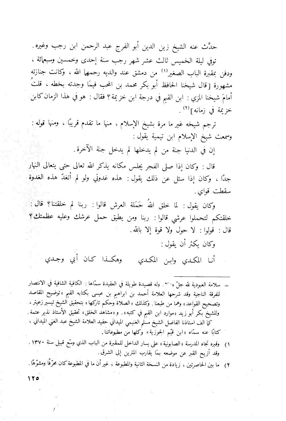 وَمِنْهُم الشَّيْخ الإِمَام الْعَلامَة قَاضِي قُضَاة الْمُسلمين جمال الدّين مُفِيد الطالبين أَبُو الثَّنَاء مَحْمُود بن الشَّيْخ شهَاب الدّين أبي الْعَبَّاس أَحْمد بن مَسْعُود الشهير بِابْن السراج القونوي الْحَنَفِيّ لَهُ دروس تشهد بتقدمه وفهمه ومؤلفات تفصح عَن تَحْقِيقه وَعلمه توفّي سنة سبعين وَسَبْعمائة بِدِمَشْق عَن سِتّ وَسبعين سنة كتب بِخَطِّهِ خطْبَة من خطب الشَّيْخ تَقِيّ الدّين ثمَّ كتب ابْن السراج بعد فَرَاغه مِنْهَا هَذِه الْخطْبَة خطب بهَا شيخ الْإِسْلَام تَقِيّ الدّين ابو الْعَبَّاس ابْن تَيْمِية حِين خرج من حبس الاسكندرية بِالْمَدْرَسَةِ الكاملية فِي الْقَاهِرَة فِي جمع كثير من الْعلمَاء والأمراء وَغَيرهم انْتهى مَا كتبه