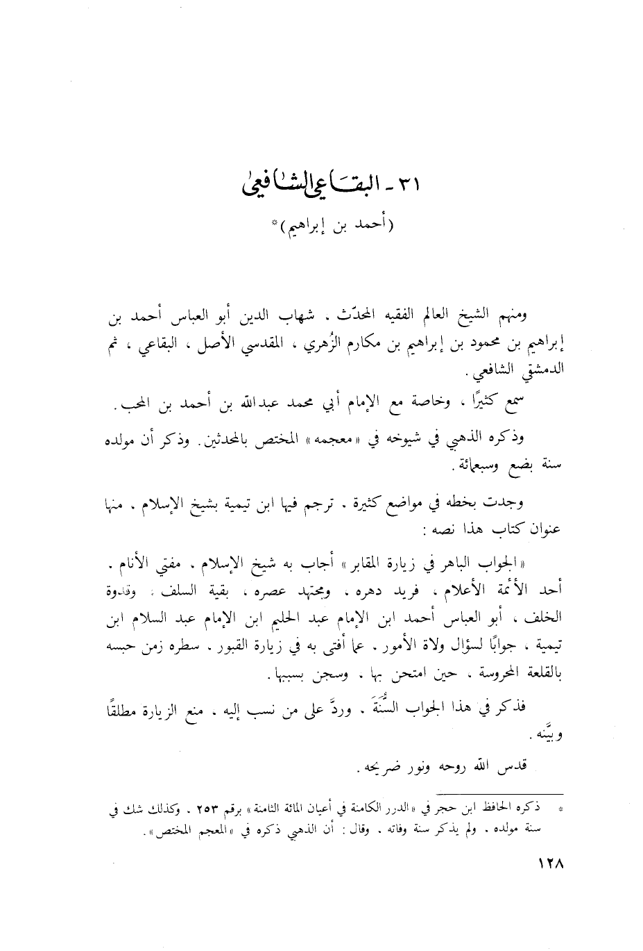 وصنف فِيهِ الْحَافِظ الْعَلامَة أَبُو سعيد العلائي مصنفا سَمَّاهُ سلوان التعزي بِالْحَافِظِ أبي الْحجَّاج الْمزي حَدثنَا عَنهُ غير وَاحِد من الشُّيُوخ فانبؤنا عَنهُ أَنه قَالَ عَن شيخ الاسلام أبي الْعَبَّاس ابْن تَيْمِية مَا رَأَيْت مثله وَلَا رأى هُوَ مثل