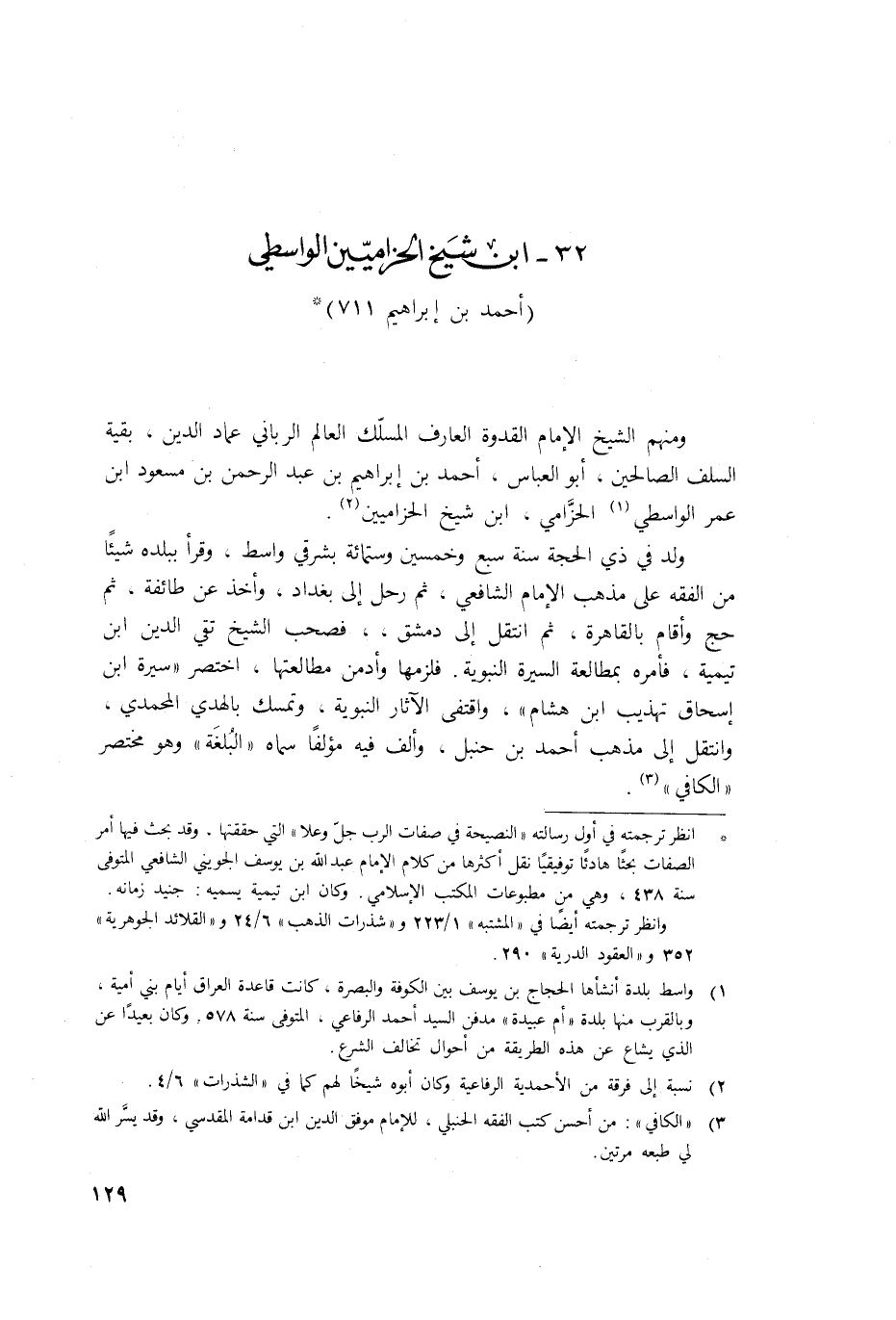 وَأخْبرنَا أَبُو حَفْص عمر بن الامام أبي عبد الله مُحَمَّد بن احْمَد بن عبد الْهَادِي مشافهة عَن أَبِيه قَالَ قَالَ شَيخنَا الْحَافِظ أَبُو الْحجَّاج فَذكره وَقَالَ الْحَافِظ أَبُو عبد الله الذَّهَبِيّ نَحوه كَمَا تقدم فِي تَرْجَمَة الذَّهَبِيّ وَقَالَ الْمزي أَيْضا عَن الشَّيْخ تَقِيّ الدّين ابْن تَيْمِية لم ير مثله مُنْذُ أَرْبَعمِائَة سنة وَلَقَد كتب الْحَافِظ أَبُو الْحجَّاج الْمزي على كتاب تَرْجَمَة الشَّيْخ تَقِيّ الدّين ابْن تَيْمِية تأليف ابْن عبد الْهَادِي مَا صورته كتاب مُخْتَصر فِي ذكر حَال الشَّيْخ الامام شيخ الاسلام تَقِيّ الدّين أبي الْعَبَّاس أَحْمد بن عبد الْحَلِيم ابْن تَيْمِية الْحَرَّانِي وَذكر بعض مناقبه ومصنفاته رَضِي الله تَعَالَى عَنهُ جمع الشَّيْخ الإِمَام الْحَافِظ شمس الدّين أبي عبد الله مُحَمَّد بن احْمَد بن عبد الْهَادِي الْمَقْدِسِي أدام الله النَّفْع بفوائده وَوجدت بِخَط الْحَافِظ الْمزي فِي عدَّة من طَبَقَات سَمَاعه مَعَ الشَّيْخ تَقِيّ الدّين ابْن تَيْمِية كتب لَهُ فِيهَا الامام تَقِيّ الدّين مِنْهَا على جُزْء أبي السكن زَكَرِيَّا ابْن يحيى الطَّائِي وَهِي بِخَط الشَّيْخ تَقِيّ الدّين مَا صورته
