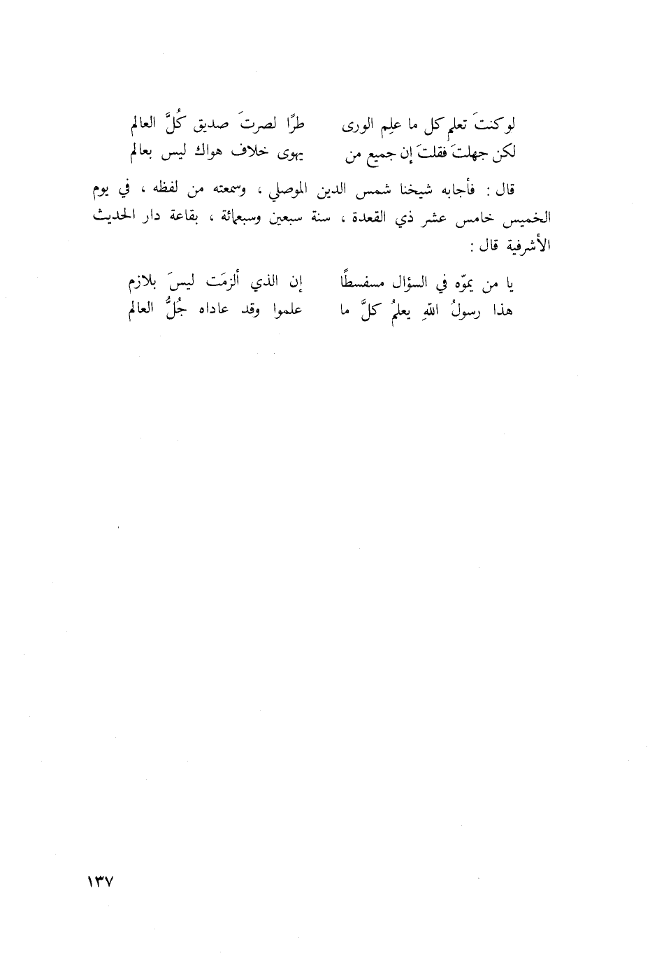 فأنبأنا غير وَاحِد من الشُّيُوخ مِنْهُم أَبُو هُرَيْرَة عبد الرَّحْمَن بن الْحَافِظ أبي عبد الله مُحَمَّد بن أَحْمد ابْن الذَّهَبِيّ عَن الْحَافِظ أبي مُحَمَّد الْقَاسِم بن مُحَمَّد ابْن البرزالي قَالَ انشدنا أَبُو الْحسن عَليّ بن مُحَمَّد بن سلمَان بن غَانِم الْمَقْدِسِي لنَفسِهِ فِيمَا قرأته عَلَيْهِ فِي ذِي الْقعدَة سنة تسع وَعشْرين وَسَبْعمائة فِيمَا رثي بِهِ الشَّيْخ تَقِيّ الدّين ابْن تَيْمِية رَحْمَة الله عَلَيْهِ وَهِي أول مَا قيل بديها على الضريح ... أَي حبر مضى وَأي إِمَام ... فجعت فِيهِ مِلَّة الاسلام