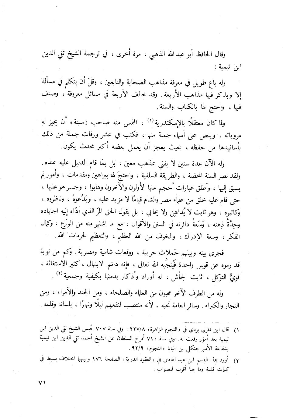 وَمِنْهُم الشَّيْخ الامام الْقدْوَة الْعَارِف المسلك الْعَالم الرباني عماد الدّين بَقِيَّة السّلف الصَّالِحين أَبُو الْعَبَّاس احْمَد بن ابراهيم بن عبد الرَّحْمَن بن مَسْعُود ابْن عمر الوَاسِطِيّ الْحزَامِي ابْن شيخ الحزاميين ولد فِي ذِي الْحجَّة سنة سبع وَخمسين وسِتمِائَة بشرقي وَاسِط وَقَرَأَ بِبَلَدِهِ شَيْئا من الْفِقْه على مَذْهَب الامام الشَّافِعِي ثمَّ رَحل الى بَغْدَاد وَأخذ عَن طَائِفَة ثمَّ حج وَأقَام بِالْقَاهِرَةِ ثمَّ انْتقل الى دمشق فصحب الشَّيْخ تَقِيّ الدّين ابْن تَيْمِية فَأمره بمطالعة السِّيرَة النَّبَوِيَّة فلزمها وأدمن مطالعتها اختصر سيرة ابْن اسحاق تَهْذِيب ابْن هِشَام واقتفى الْآثَار النَّبَوِيَّة وَتمسك بِالْهَدْي المحمدي وانتقل الى مَذْهَب أَحْمد بن حَنْبَل وَألف فِيهِ مؤلفا سَمَّاهُ الْبلْغَة وَهُوَ مُخْتَصر الْكَافِي وَله مؤلفات كَثِيرَة غالبها فِي اقتفاء السّنة وَطَرِيق التصوف على السّنة وَالرَّدّ على طوائف من المبتدعة كالاتحادية وَغَيرهم وَكَانَ زاهدا عابدا دَاعِيَة الى الله معمور الاوقات بالاوراد والعبادات وَالذكر والفكر والمطالعة والتصنيف والإفادة توفّي رَحمَه الله تَعَالَى فِي آخر يَوْم السبت السَّادِس عشر